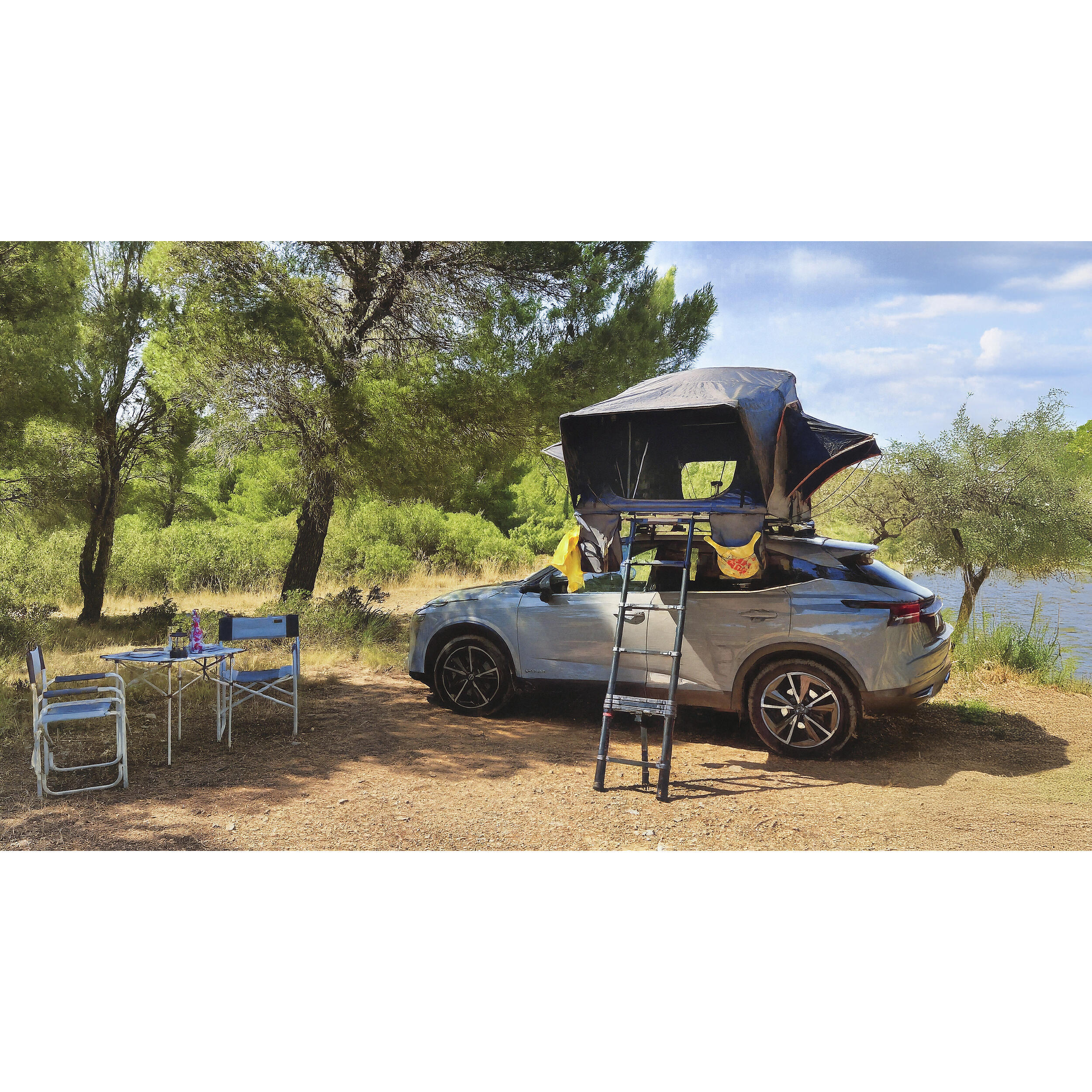 L’accès à la tente se fait grâce à une échelle télescopique en aluminium réglable jusqu’à 230 cm.