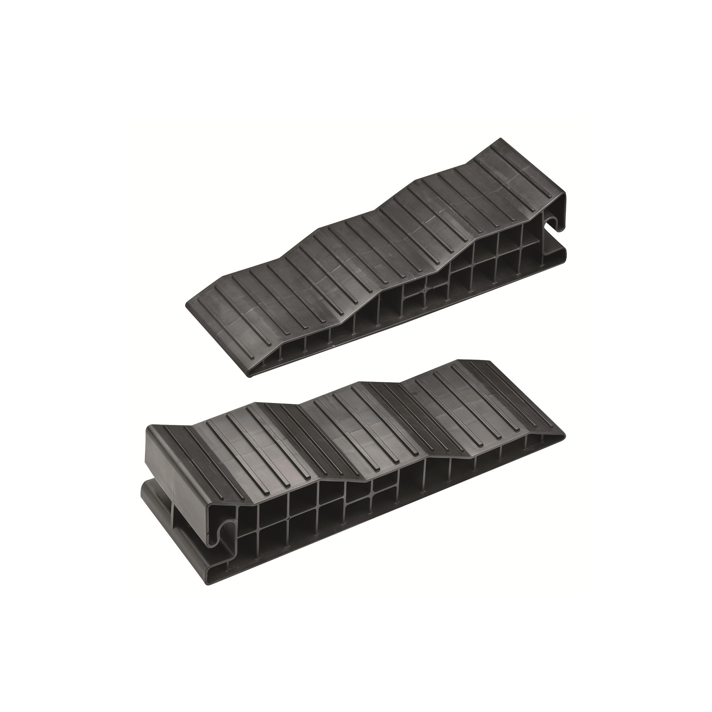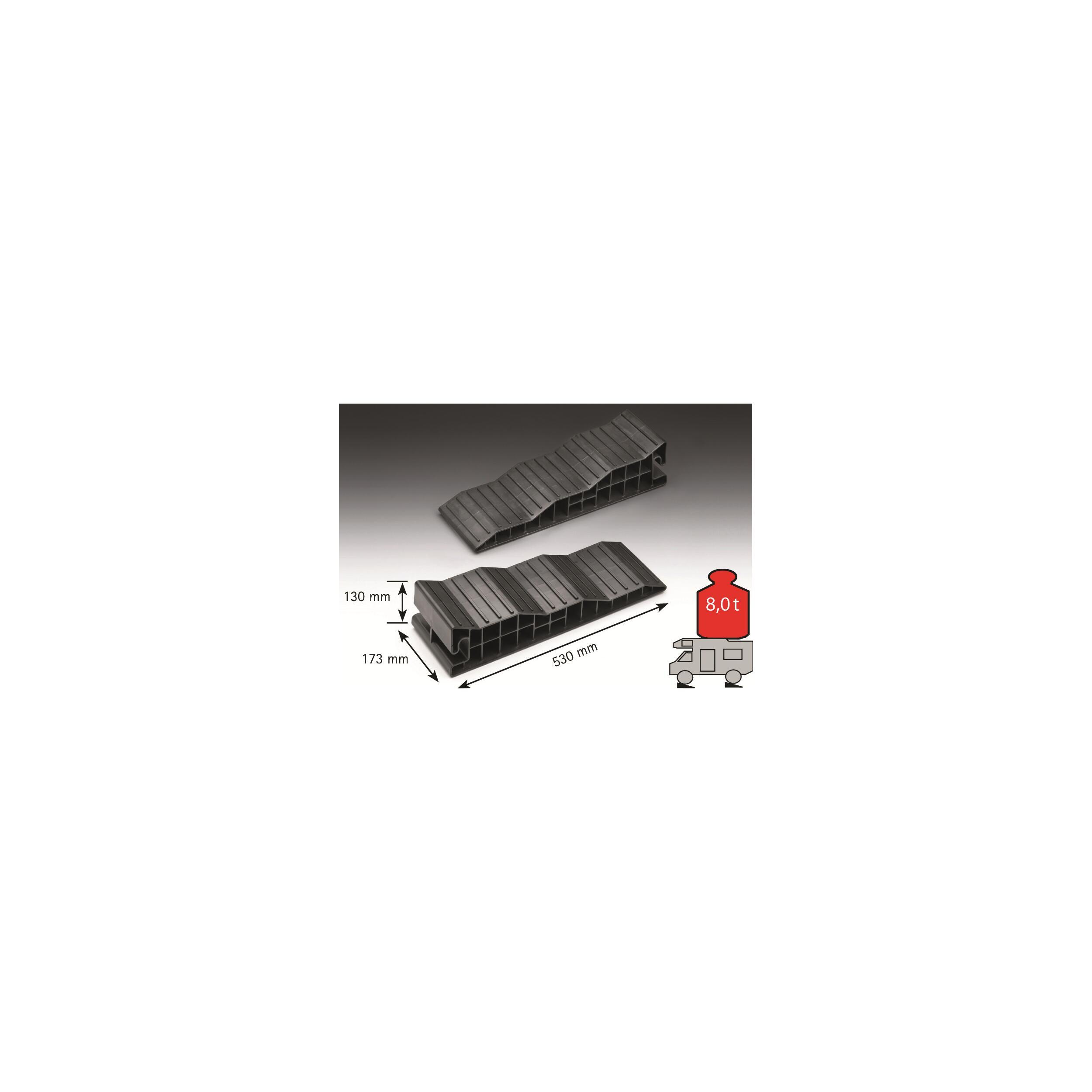 Cale à 3 niveaux : 4,5, 7,5 et 10,5 cm. Bande de roulement antidérapante pour une bonne accroche du pneu. Face inférieure anti-dérapante. Utilisable aussi bien sur terrains souples que durs.