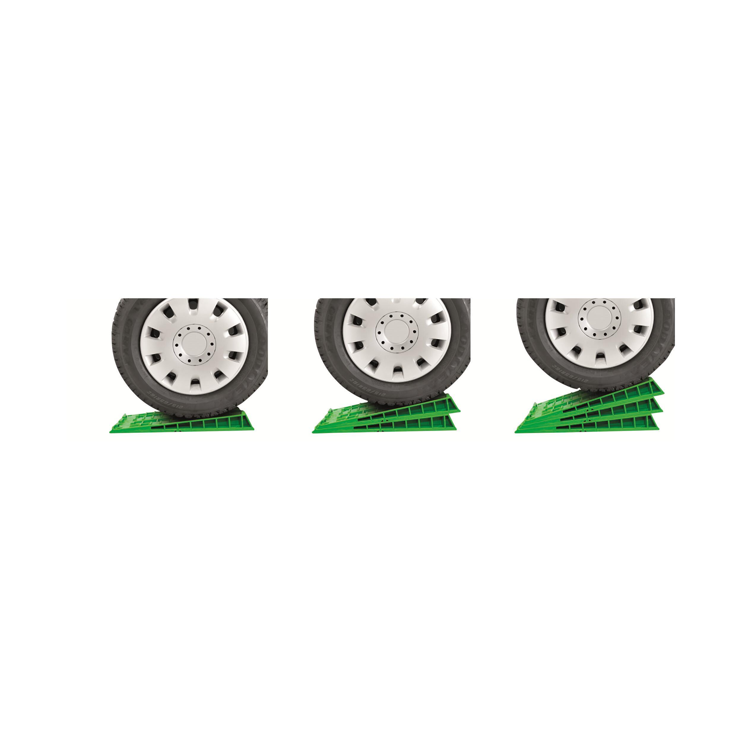 Cales ultra-compactes, empilables pour fourgons et combi jusqu’à 3,5 T. Larges de 20 cm, hautes de 5 cm elles s’empilent jusqu’à 3 unités et nivèlent jusqu’à 15 cm. Ces cales « green edition » sont composées à 95% de résine bio à base de cannes à sucre. La paire.