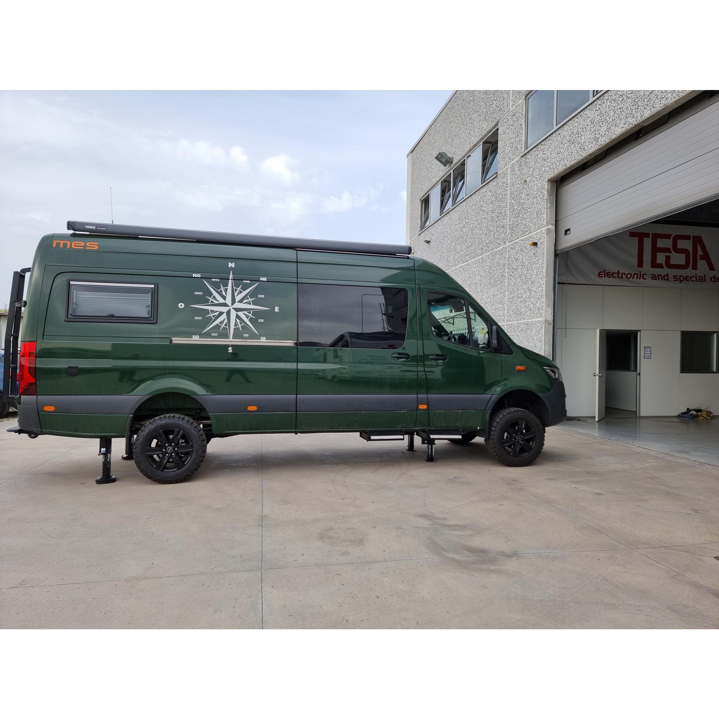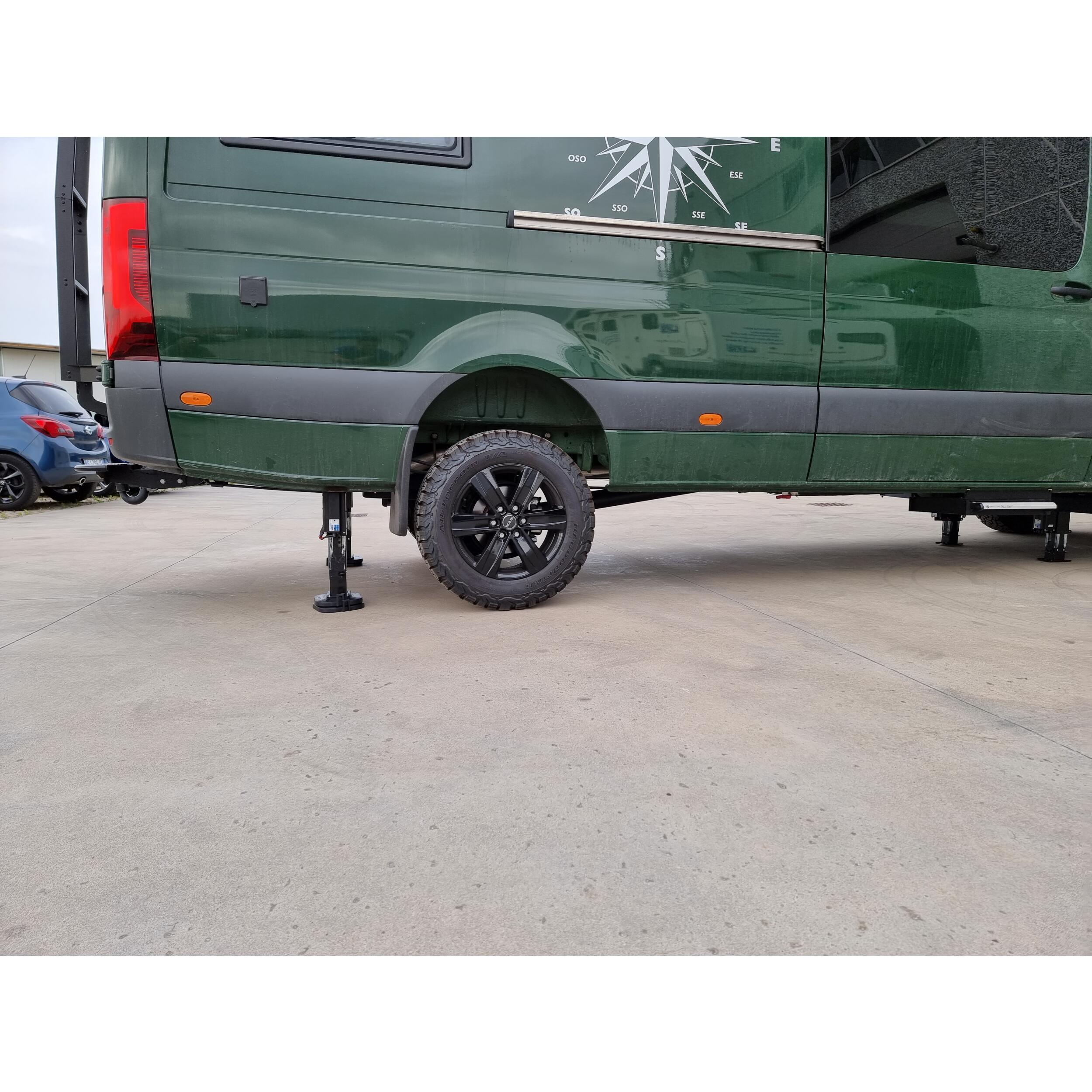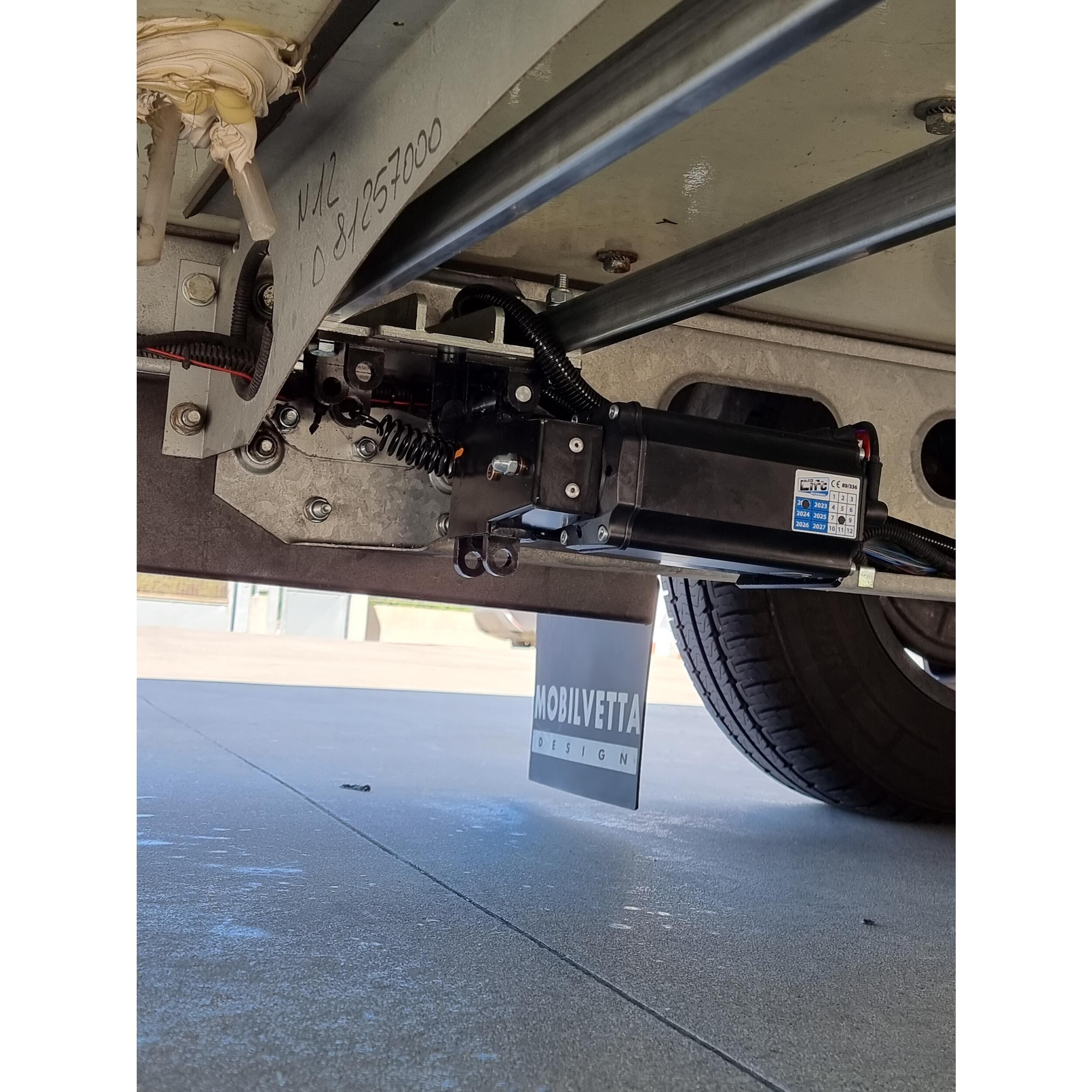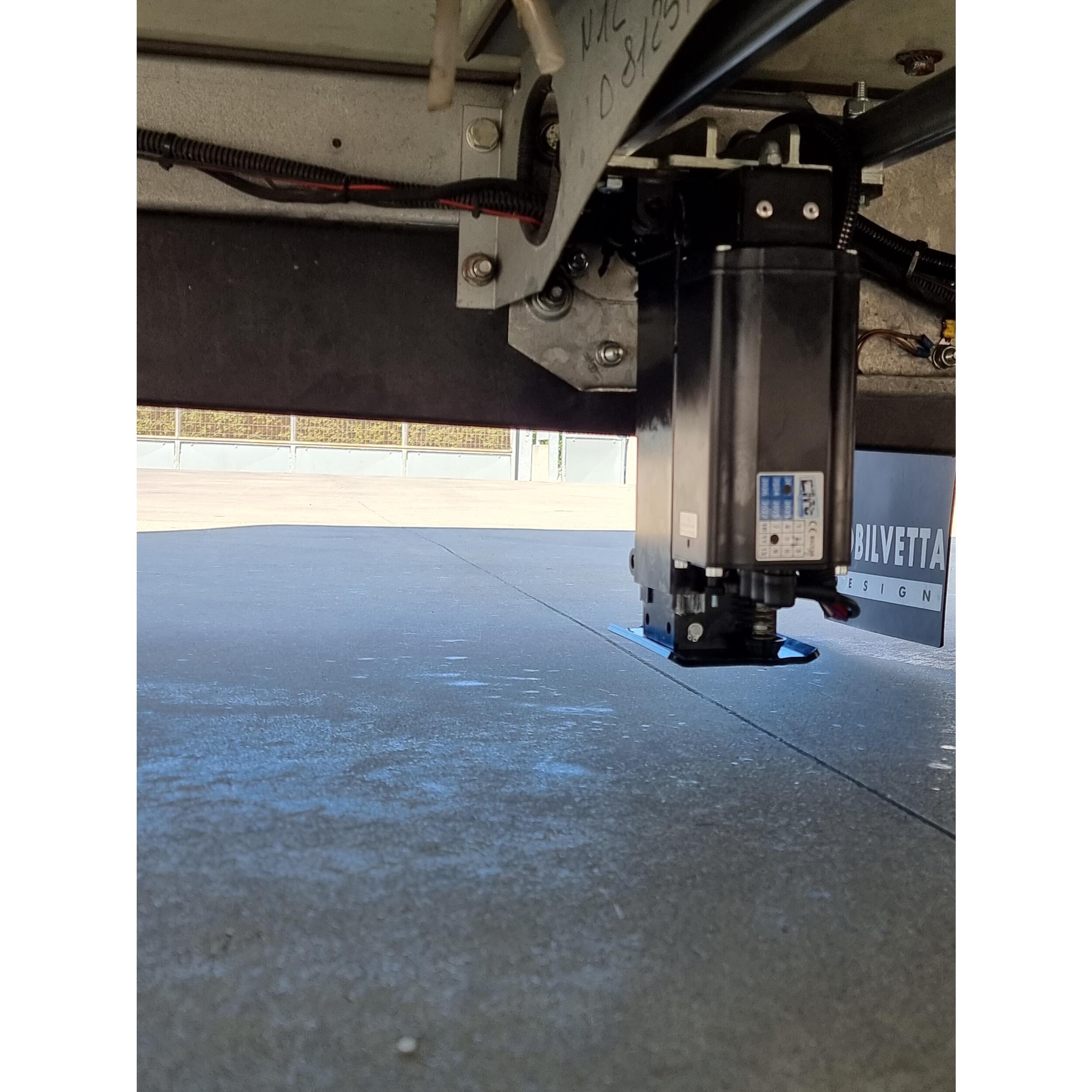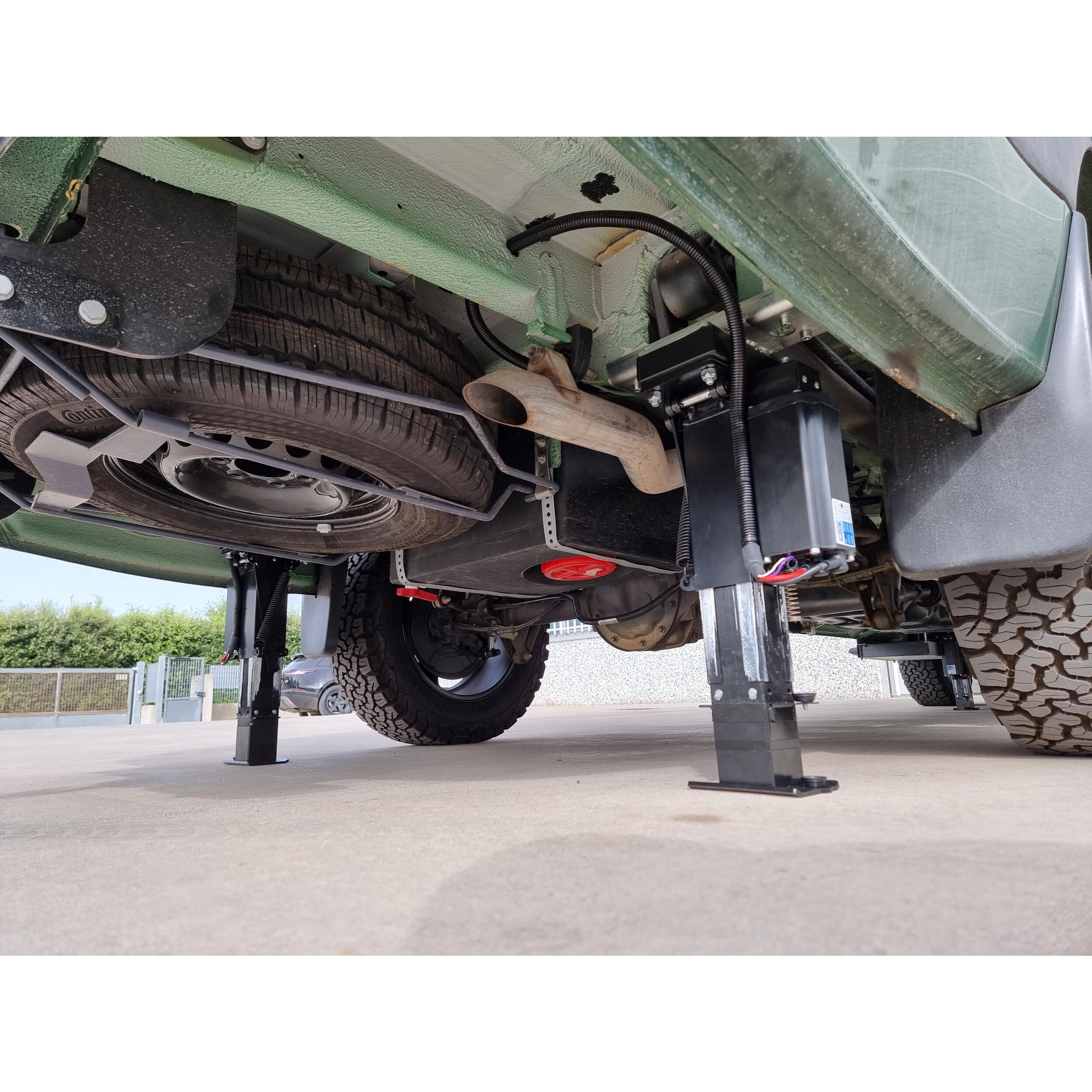 Chaque vérin, conçu pour une résistance statique jusqu’à 5 tonnes, permet de stabiliser efficacement le véhicule, même sur sol irrégulier. Le fonctionnement est piloté par une unité électrique externe entièrement précâblée, équipée d’un calculateur intelligent qui gère automatiquement l’équilibrage du véhicule.