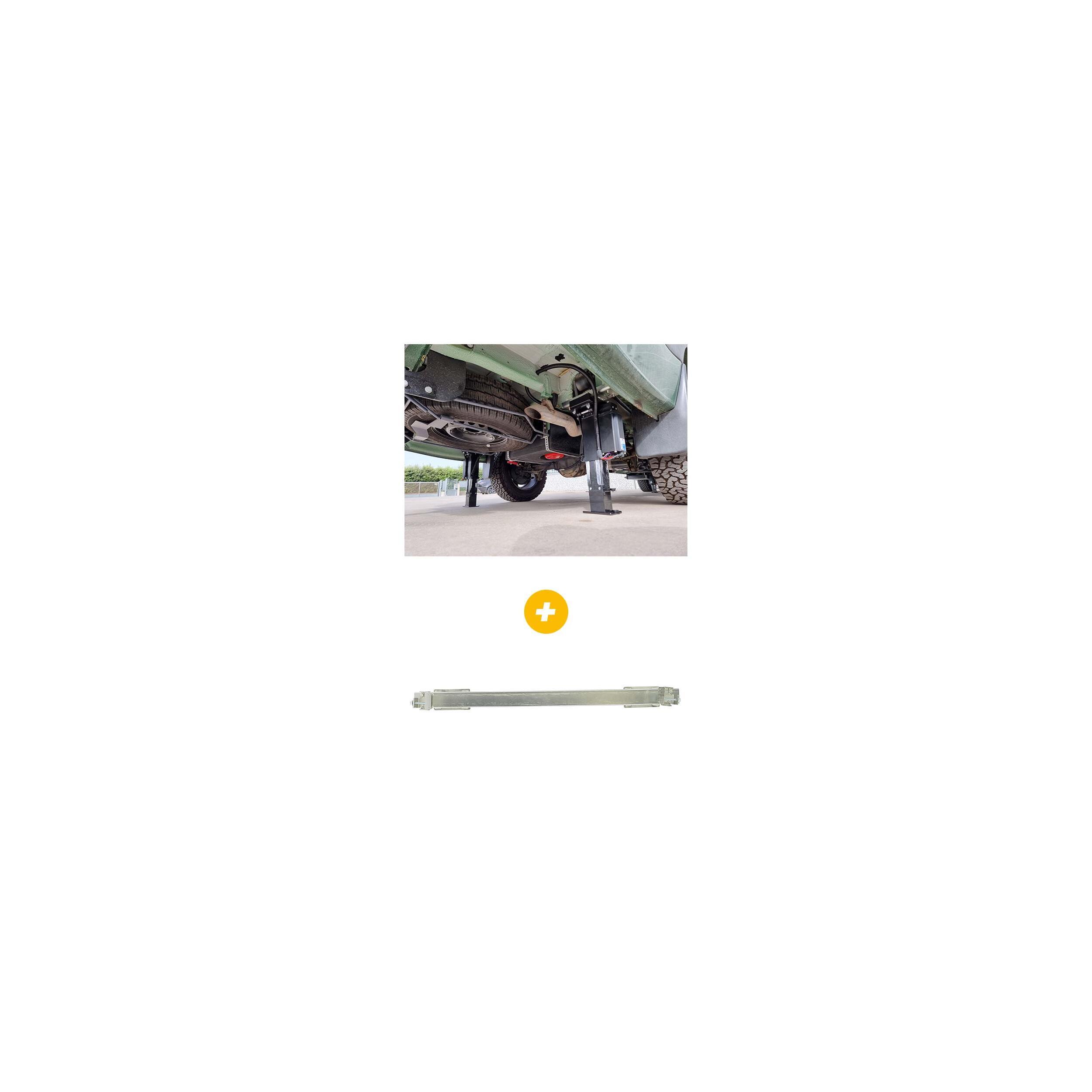 Afin d'assurer et renforcer la rigidité du châssis sur la partie arrière, l'ajout d'un kit d'adaptateurs spécifique au modèle du véhicule (non inclus) contenant les interfaces vérins/châssis et une barre de renfort de rigidité pour l'arrière est indispensable.
