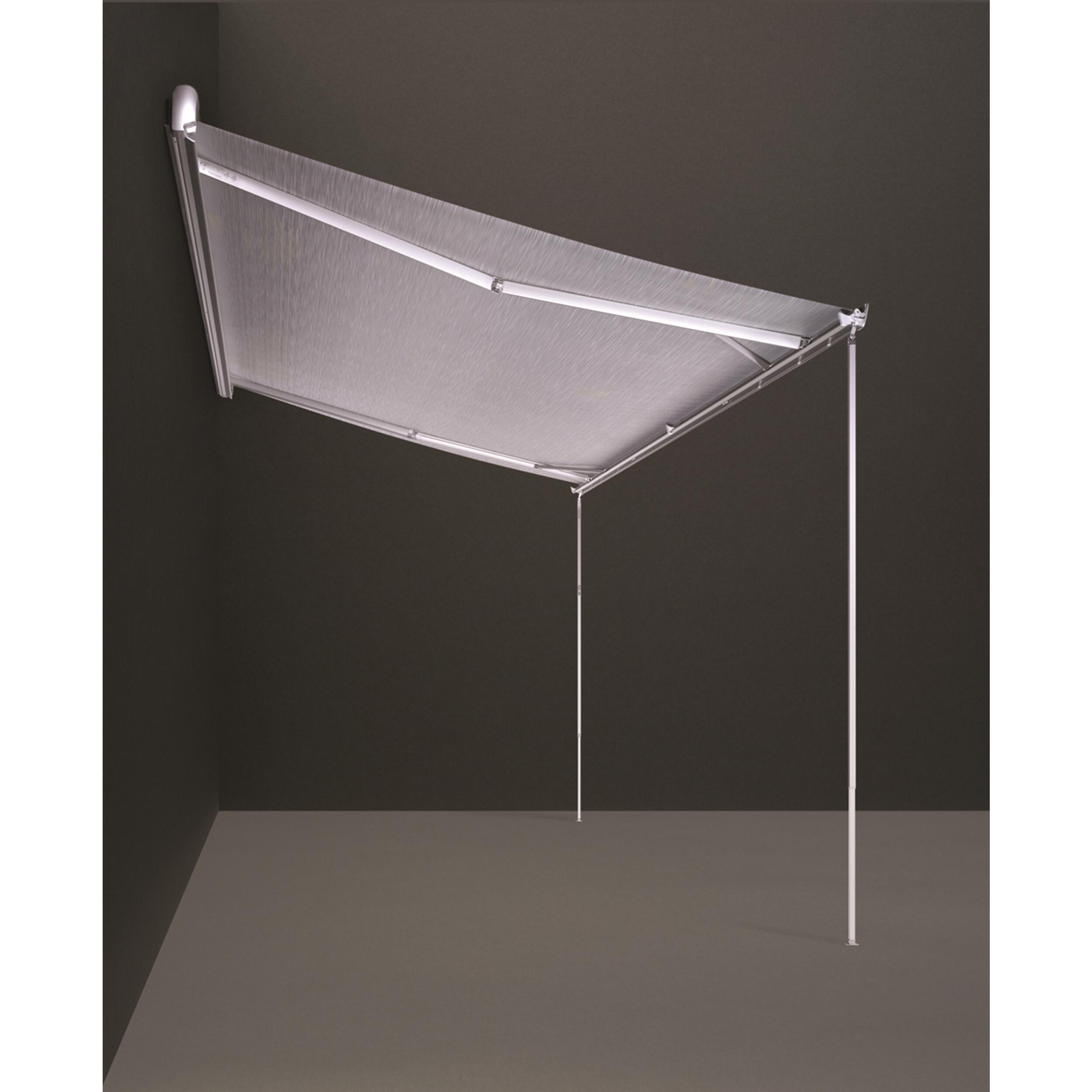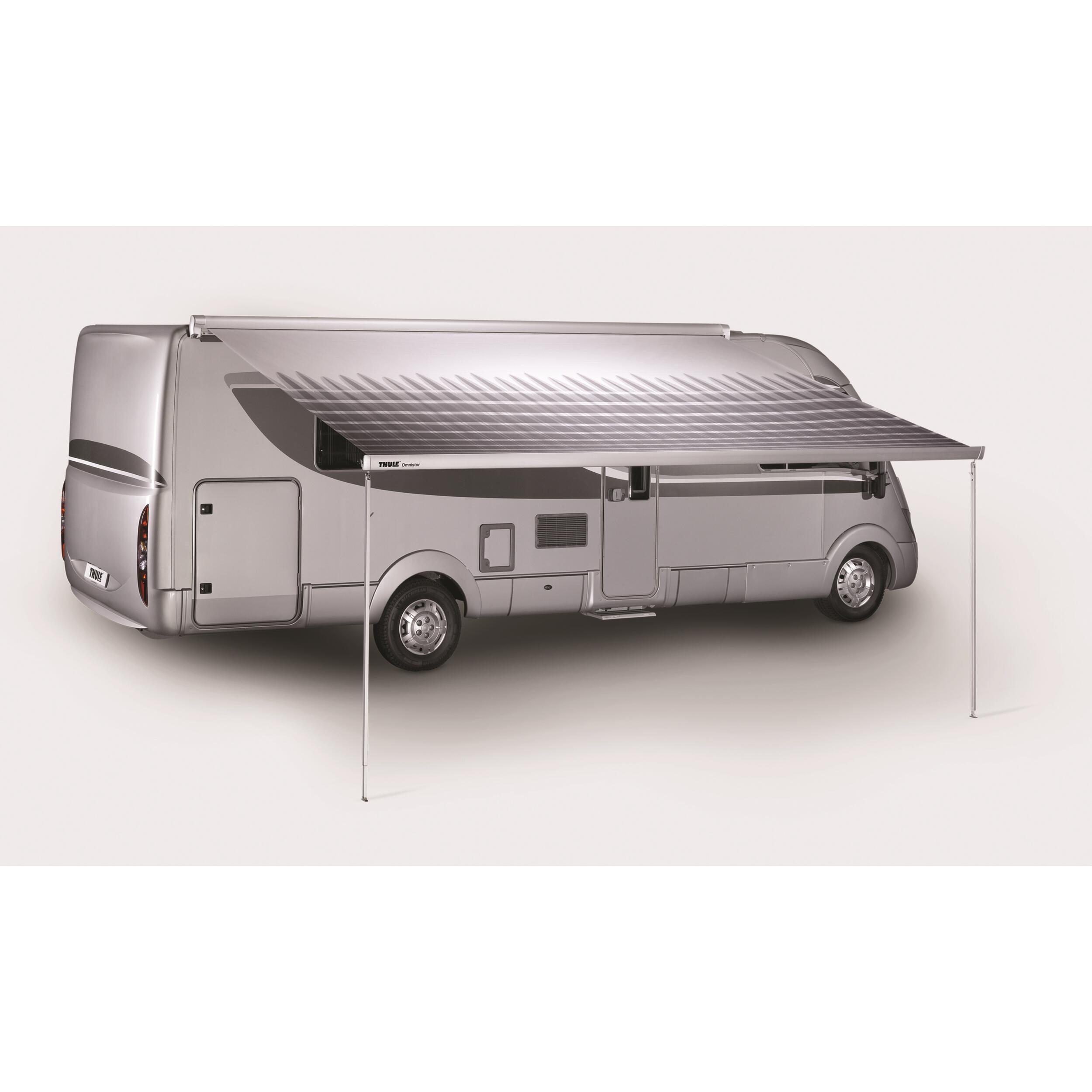 Store pour camping-car et caravane. Longueurs de 4,00 à 6,00 m avec grande avancée de 2,75 m. Montage sur paroi. Disponible en version ouverture manuelle ou avec moteur. Le système de blocage rapide est pratique pour régler facilement les pieds. Descente verticale des pieds afin de ne pas endommager le véhicule. Grâce au système unique de barre de tension intégrée, la toile est toujours parfaitement tendue. Le profilé avant dispose d'un système de drainage pour évacuer l'eau et les particules et pour faciliter le nettoyage.