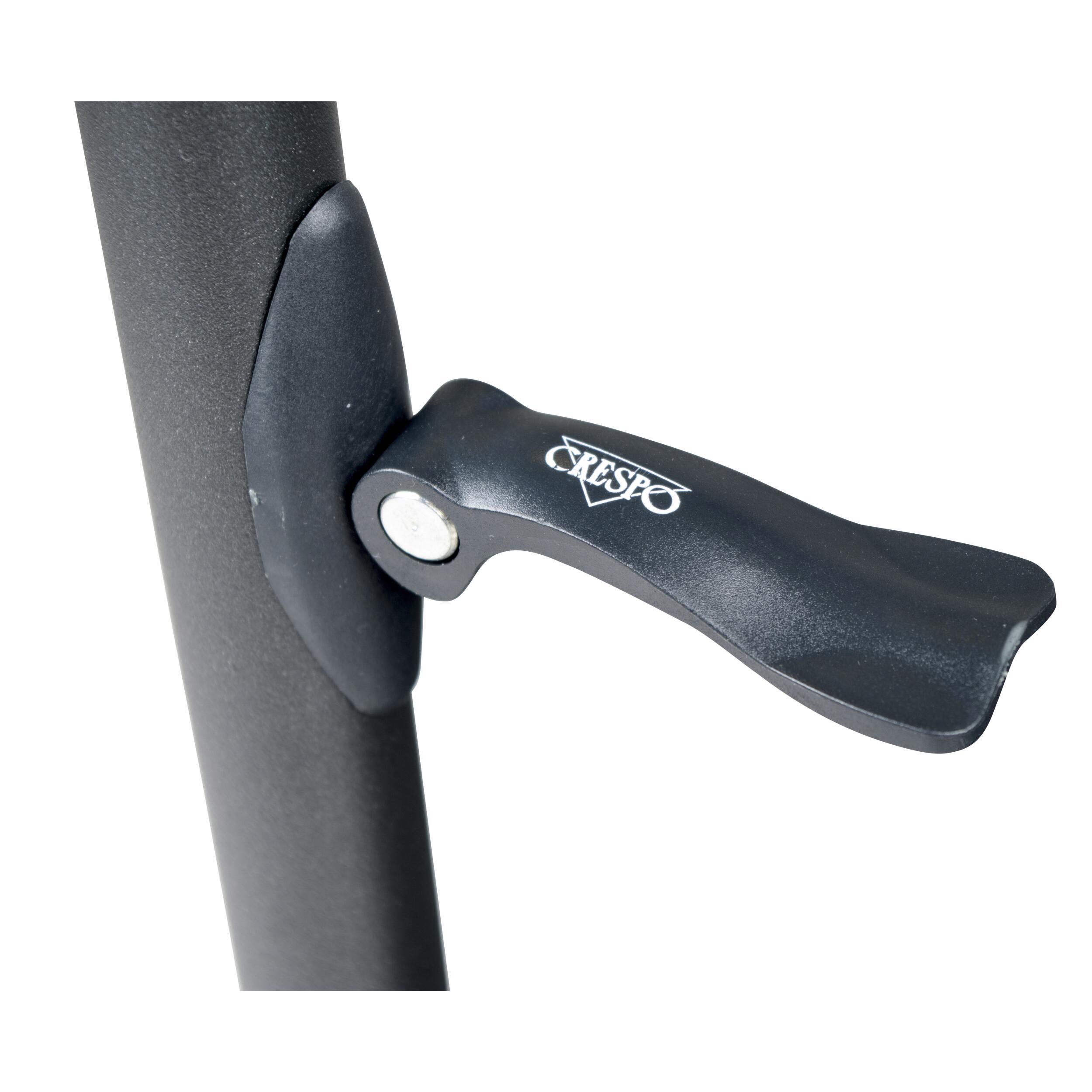 La table Crespo est très stable et légère, grâce à une structure en aluminium solide et ses pieds entièrement réglables en hauteur et équipés de patins stabilisateurs permettant de ne pas s'enfoncer dans le sol.