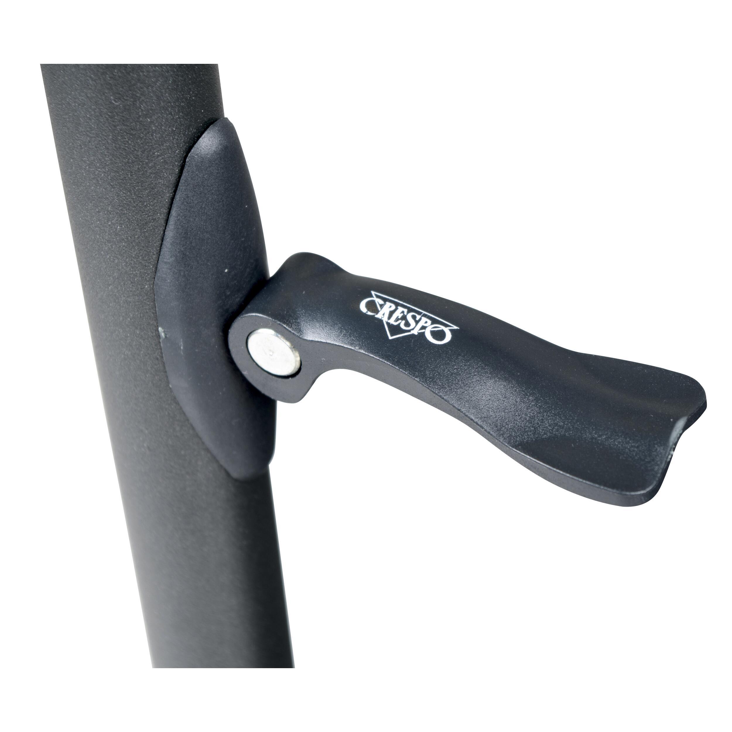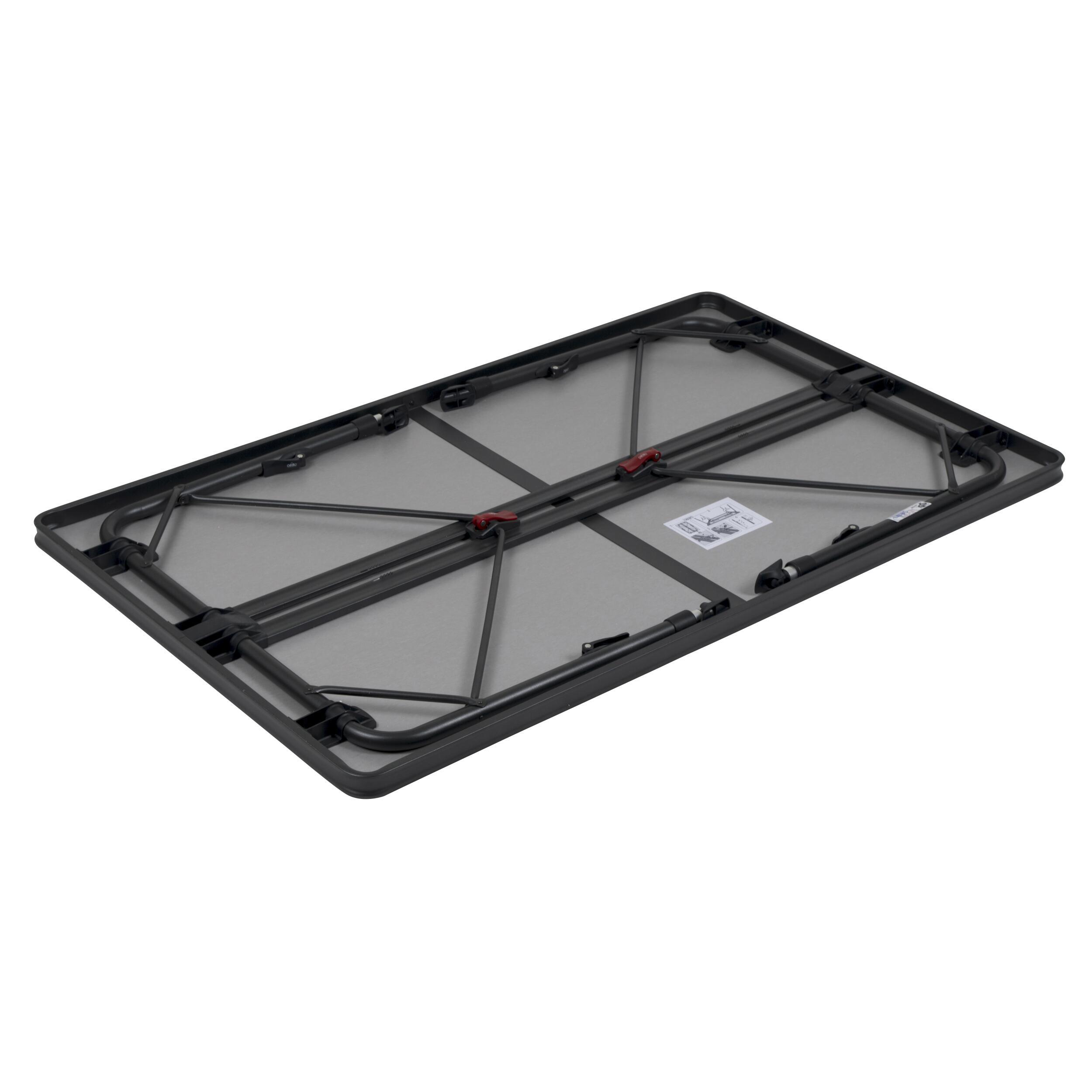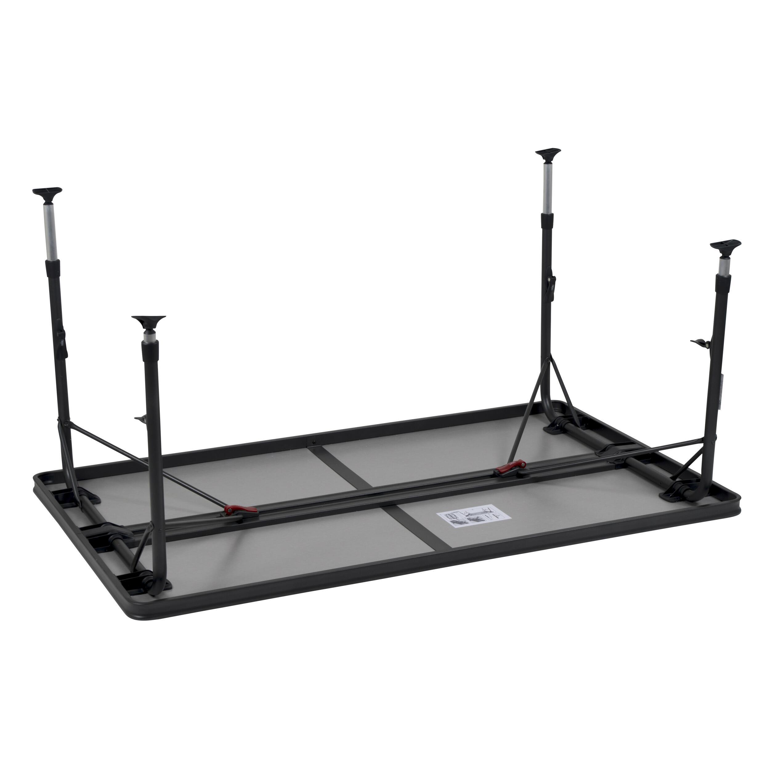 La table est équipée de pieds télescopiques réglables en hauteur de 48 à 70 cm, avec un réglage continu. Le système de verrouillage et le serrage à pince assurent un maintien sûr. Les patins stabilisateurs permettent une bonne stabilité sur sol irrégulier et évitent que les pieds ne s’enfoncent dans le sol.