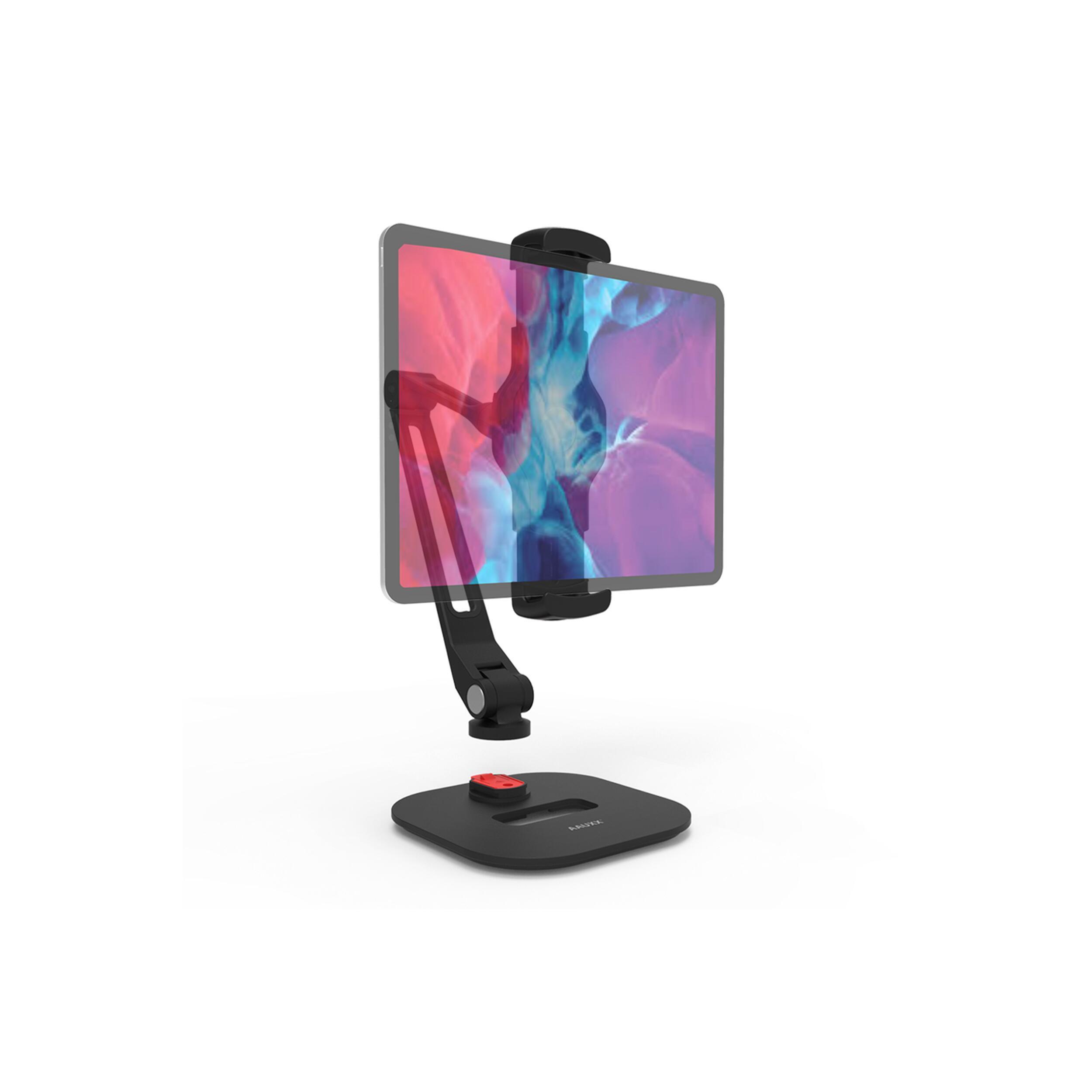 - Le bras articulé peut pivoter sur 2 points et mesure 38 cm de long. Sa pince solide permet de fixer facilement votre smartphone ou tablette en toute sécurité. Le support est compatible avec tous les appareils mesurant entre 4,7'' à 12.9'' (iPad Pro). Le système Easy Lock permet de déverrouiller rapidement le bras avec un seul bouton et d’être transféré d'un support à l'autre.