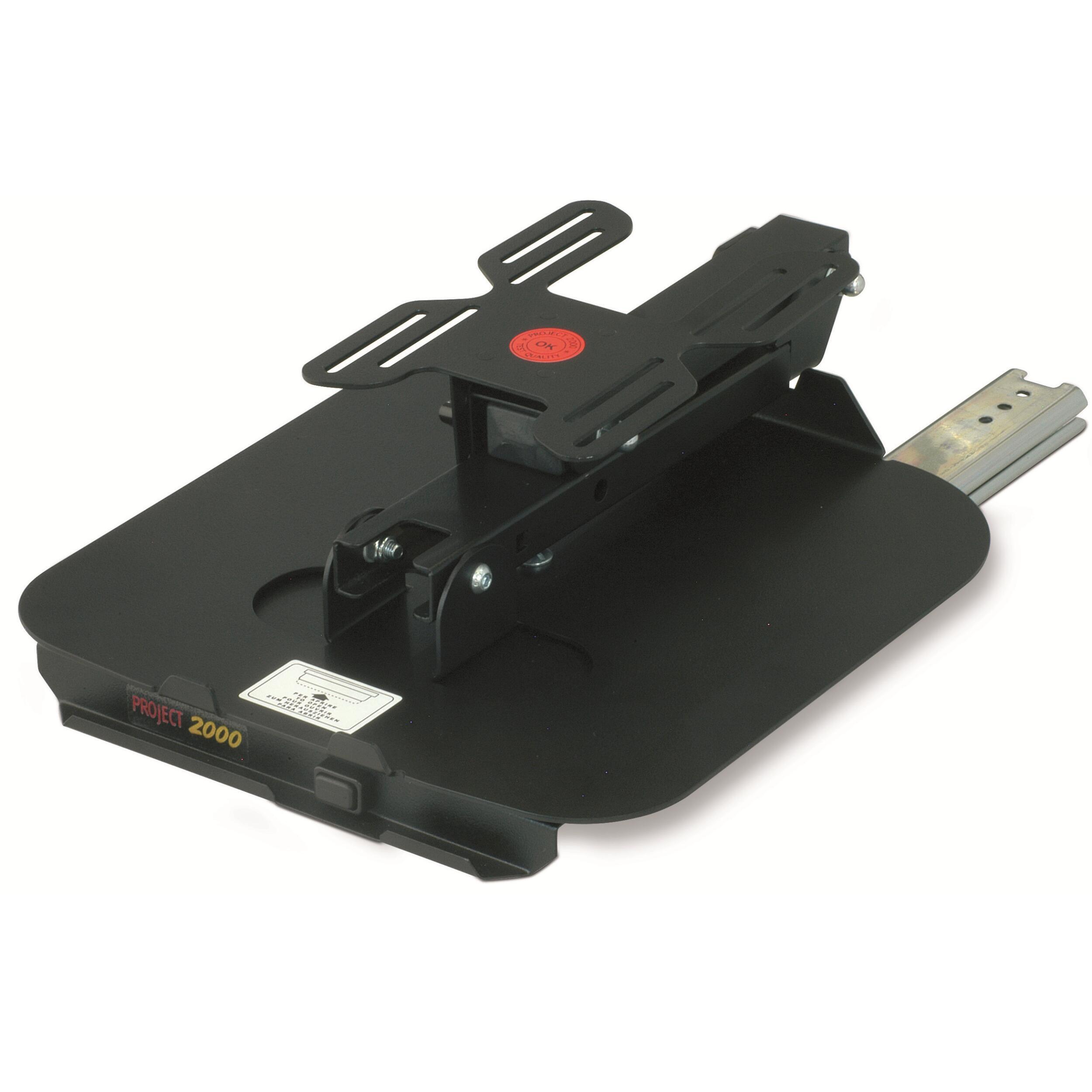 Le bras s'ouvre vers le bas pour abaisser l'écran. Sur glissière, inclinable jusqu'à 90° en arrière et orientable.