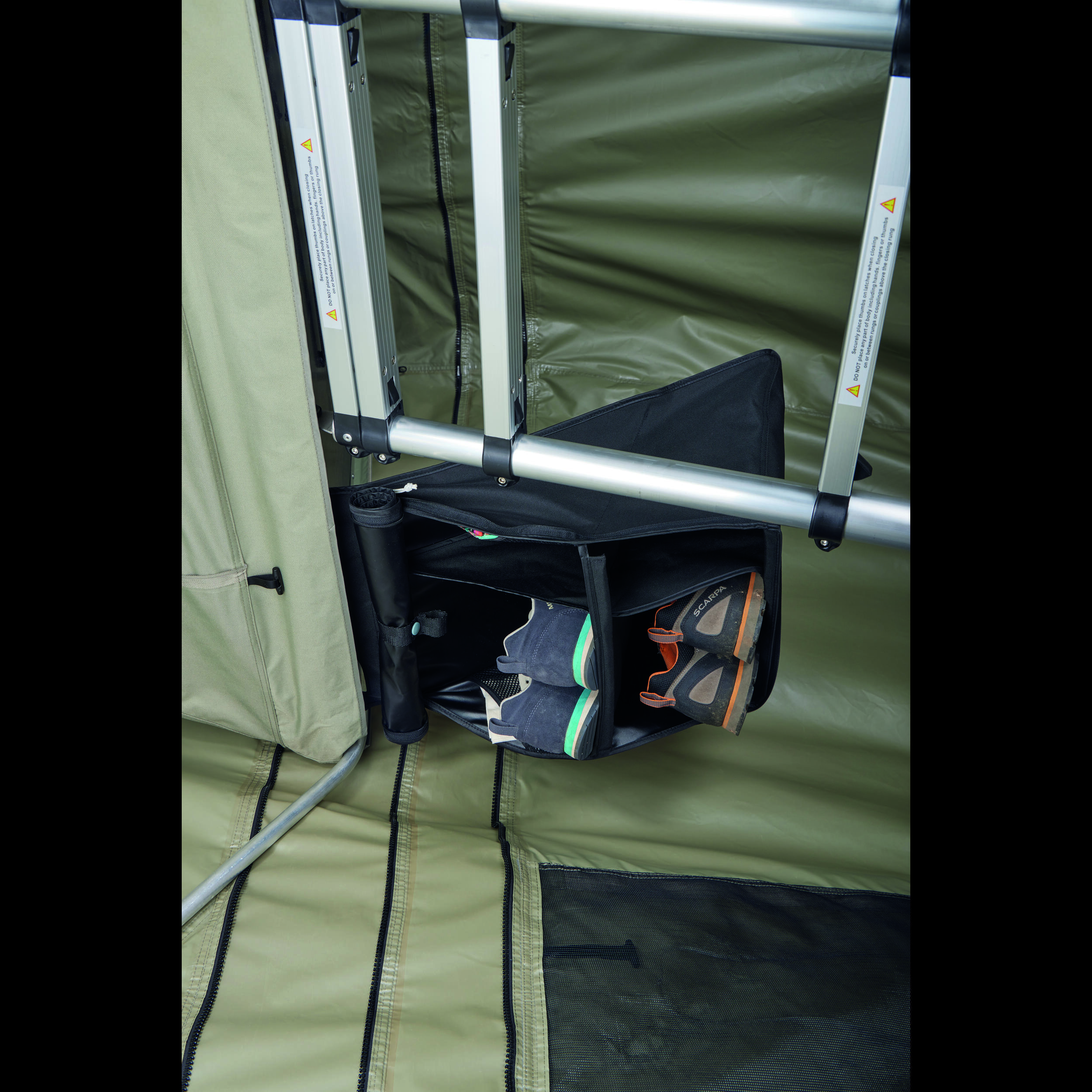 Divisé en deux grandes parties spécialement conçues pour ranger bottes ou chaussures, et doté de deux poches supplémentaires pour votre matériel de camping, cet organiseur répond parfaitement aux besoins des voyageurs. Les deux poches maillées offrent un espace idéal pour les petits objets, assurant ainsi que tout trouve sa place.Durabilité et accessibilité