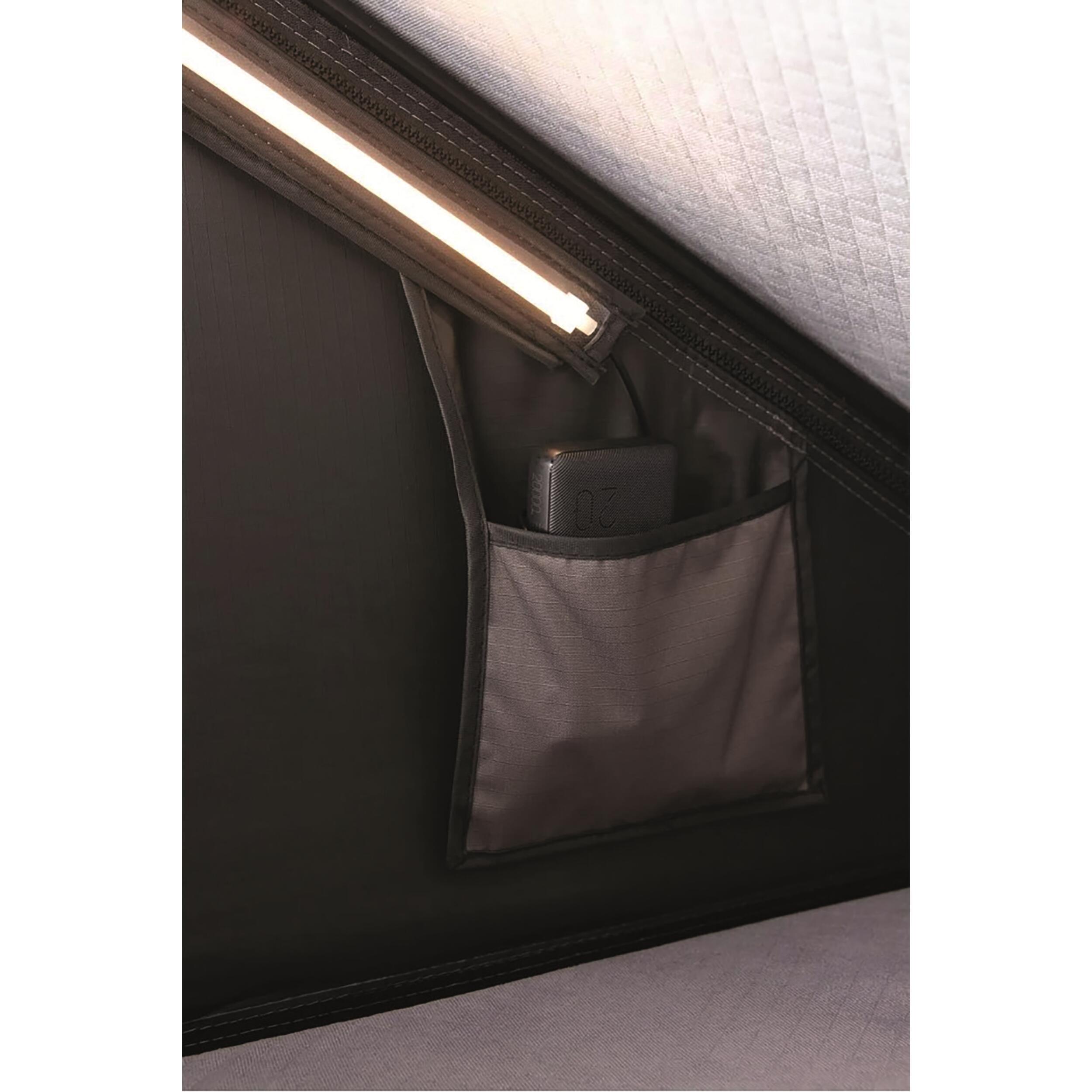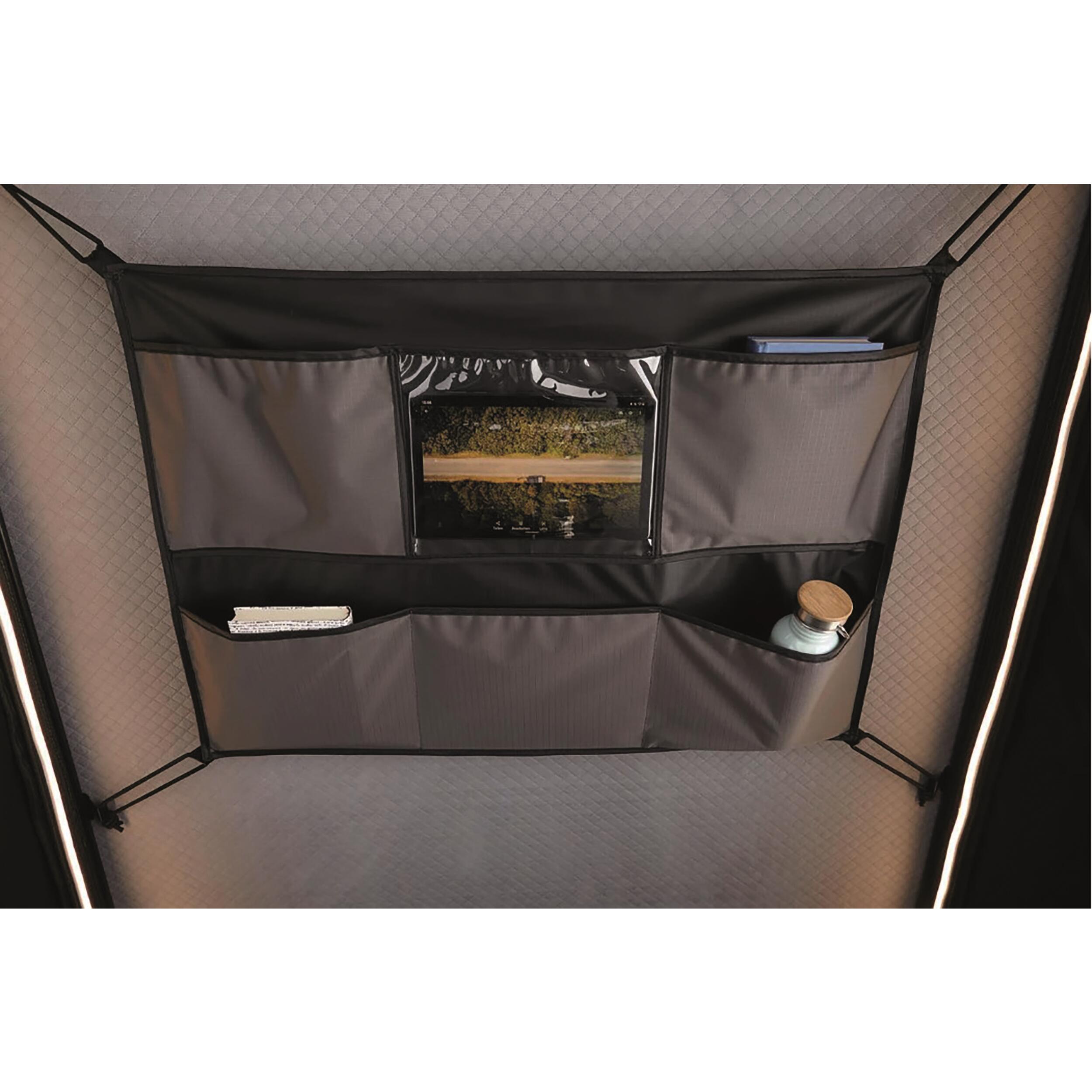 L'intérieur est judicieusement aménagé avec de multiples poches et compartiments pour un rangement pratique et organisé. Il est équipé de nombreuses poches et options de rangement, comme le compartiment coulissant, de la taille d’un iPad, idéal pour regarder un film en cas de mauvais temps.