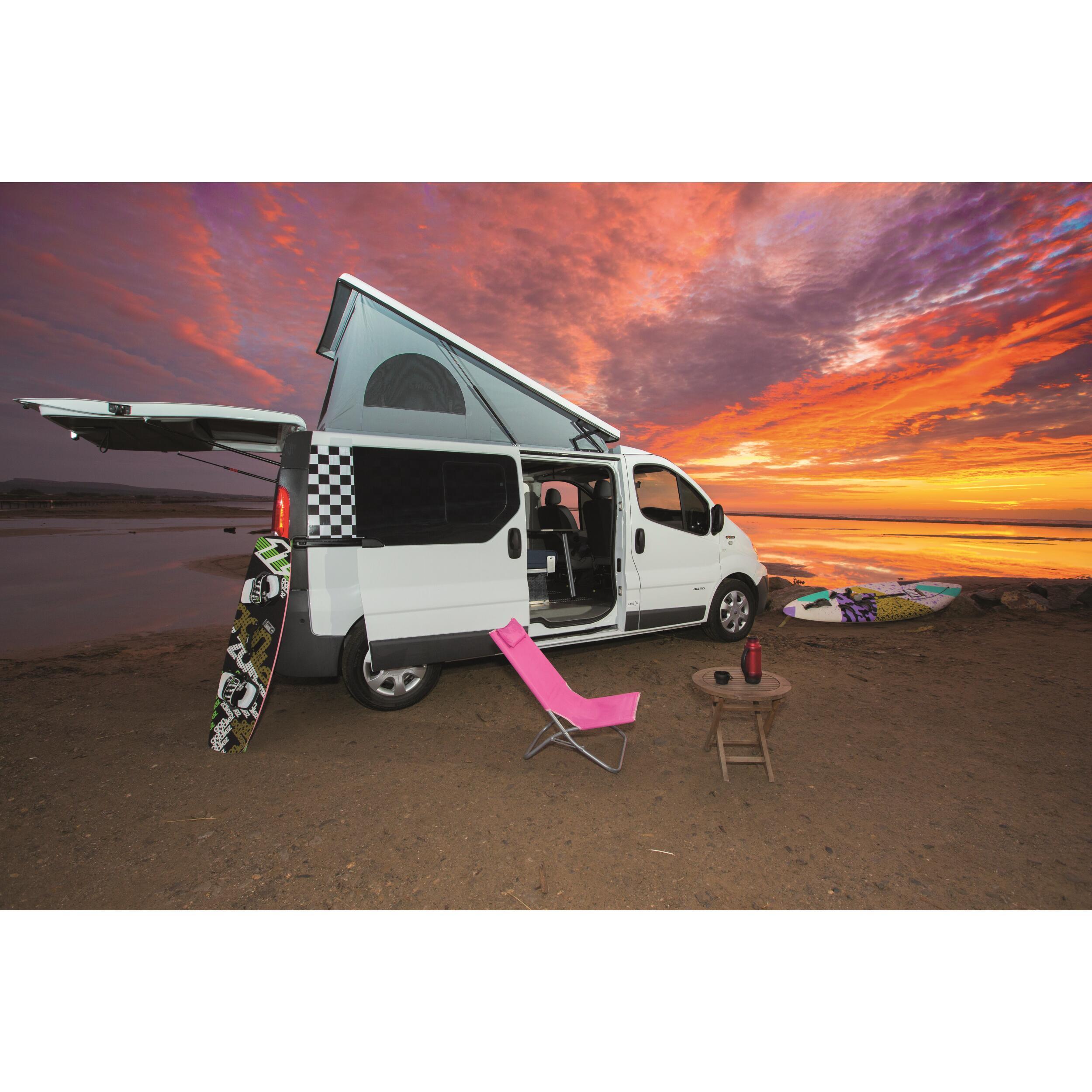 L’habillage intérieur en tissu doux ajoute une touche cosy à cet espace nuit, créant une véritable bulle de bien-être au sein de votre fourgon. Pour encore plus de praticité, la toile en polyester du toit est traitée anti-UV et intègre trois ouvertures avec fermetures coulissantes, équipées de moustiquaires et de rideaux occultants. Vous profitez ainsi d’une excellente ventilation tout en préservant votre intimité.