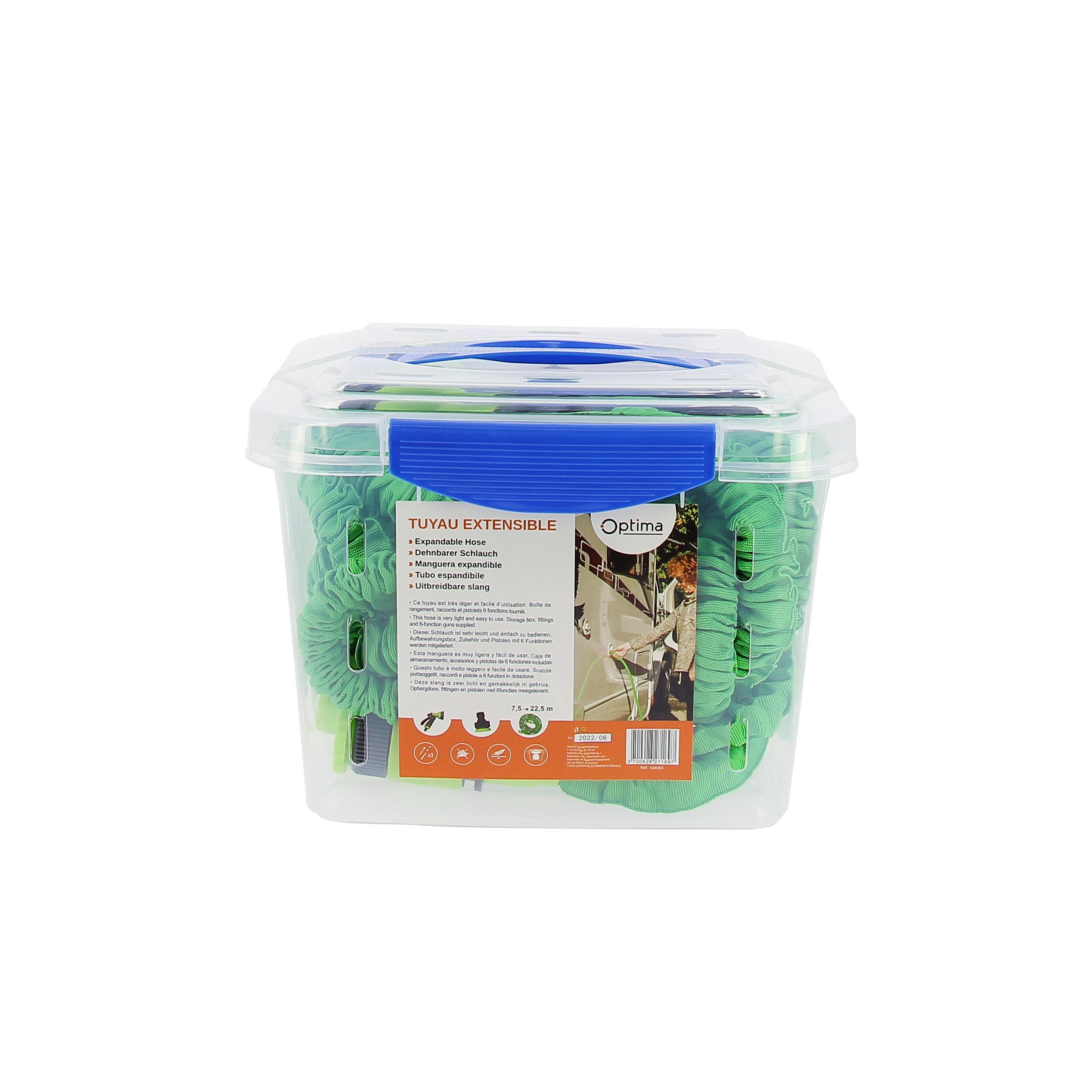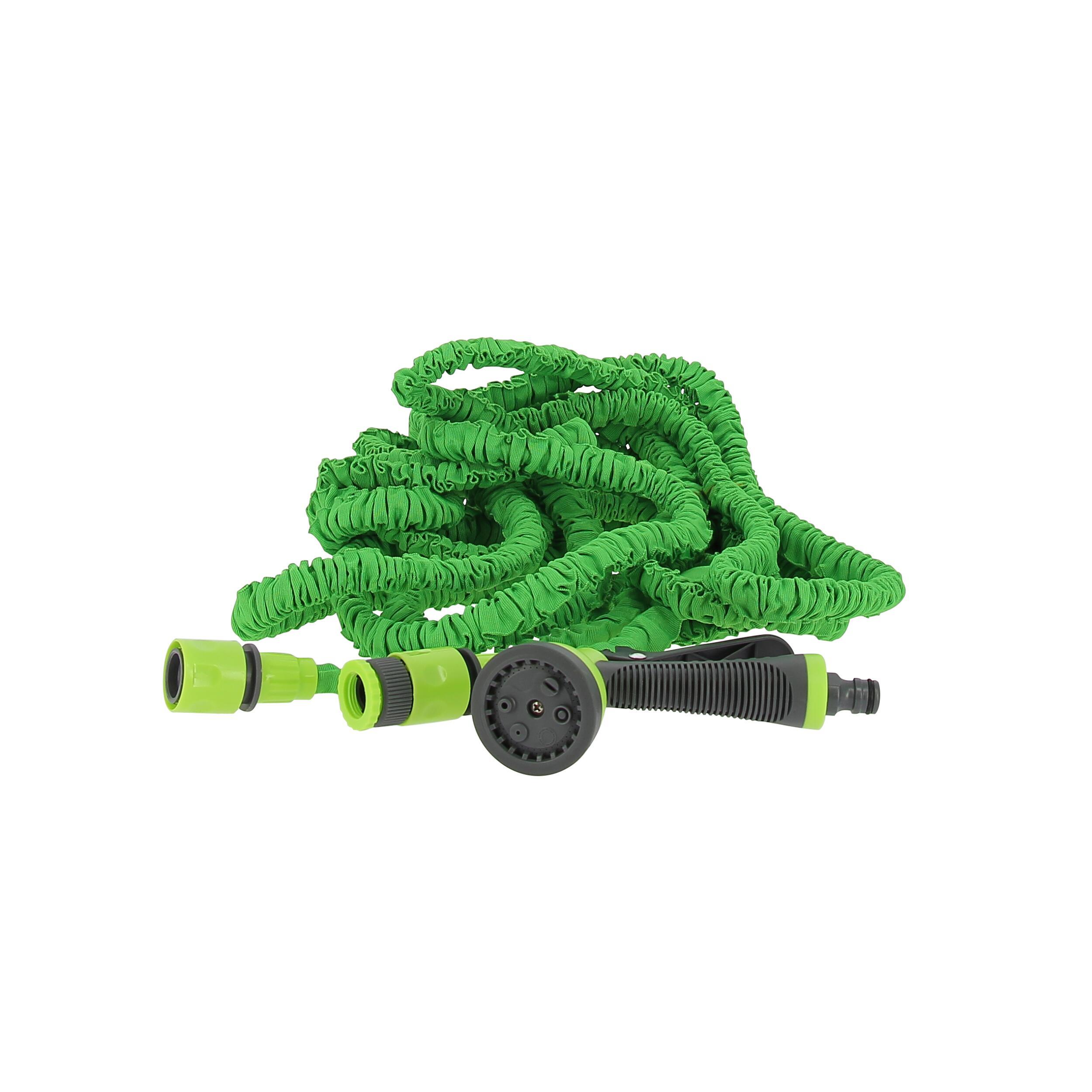 Tuyau d'arrosage souple et flexible, extensible de 7,5 m à 22,5 m. Lorsque vous l'utilisez, la pression de l'eau rend le tuyau extensible jusqu'à 3 fois sa taille. Le tuyau s'étend jusqu'à 22,5 m et il se rétracte automatiquement après son utilisation.