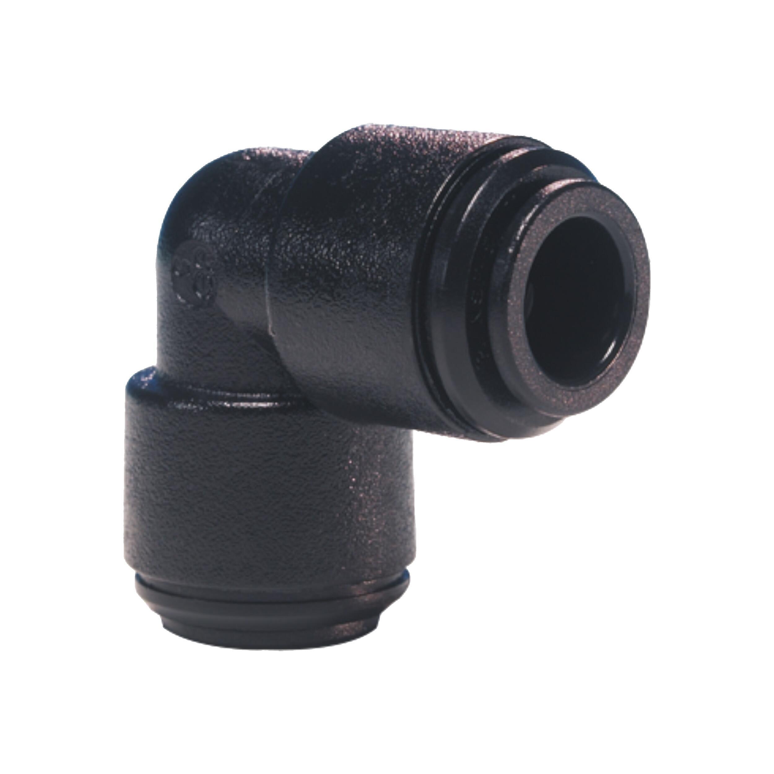 Le raccord coudé égal en acétal noir pushfit John Guest relie deux tuyaux de taille équivalente pour former un coude à 90°.