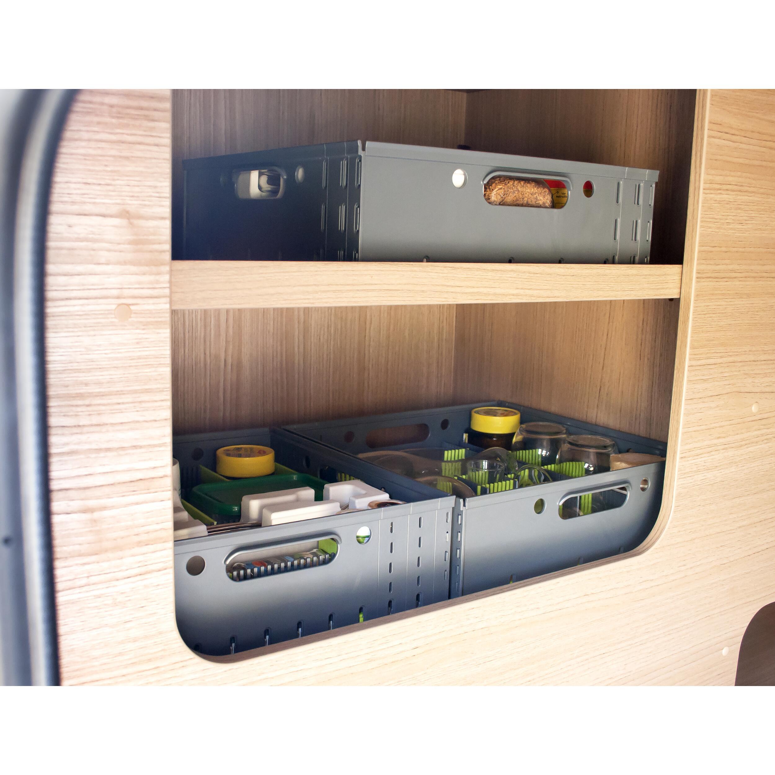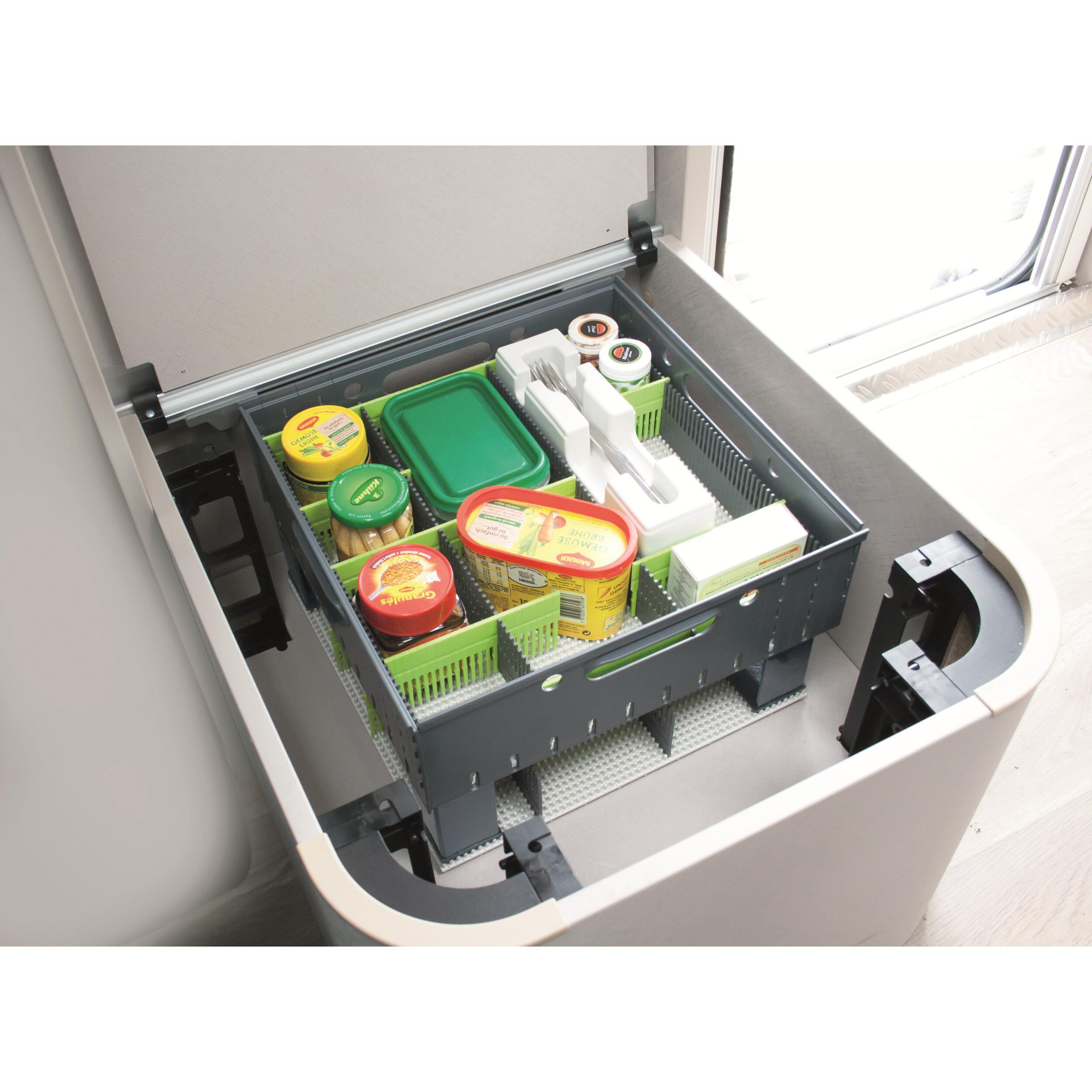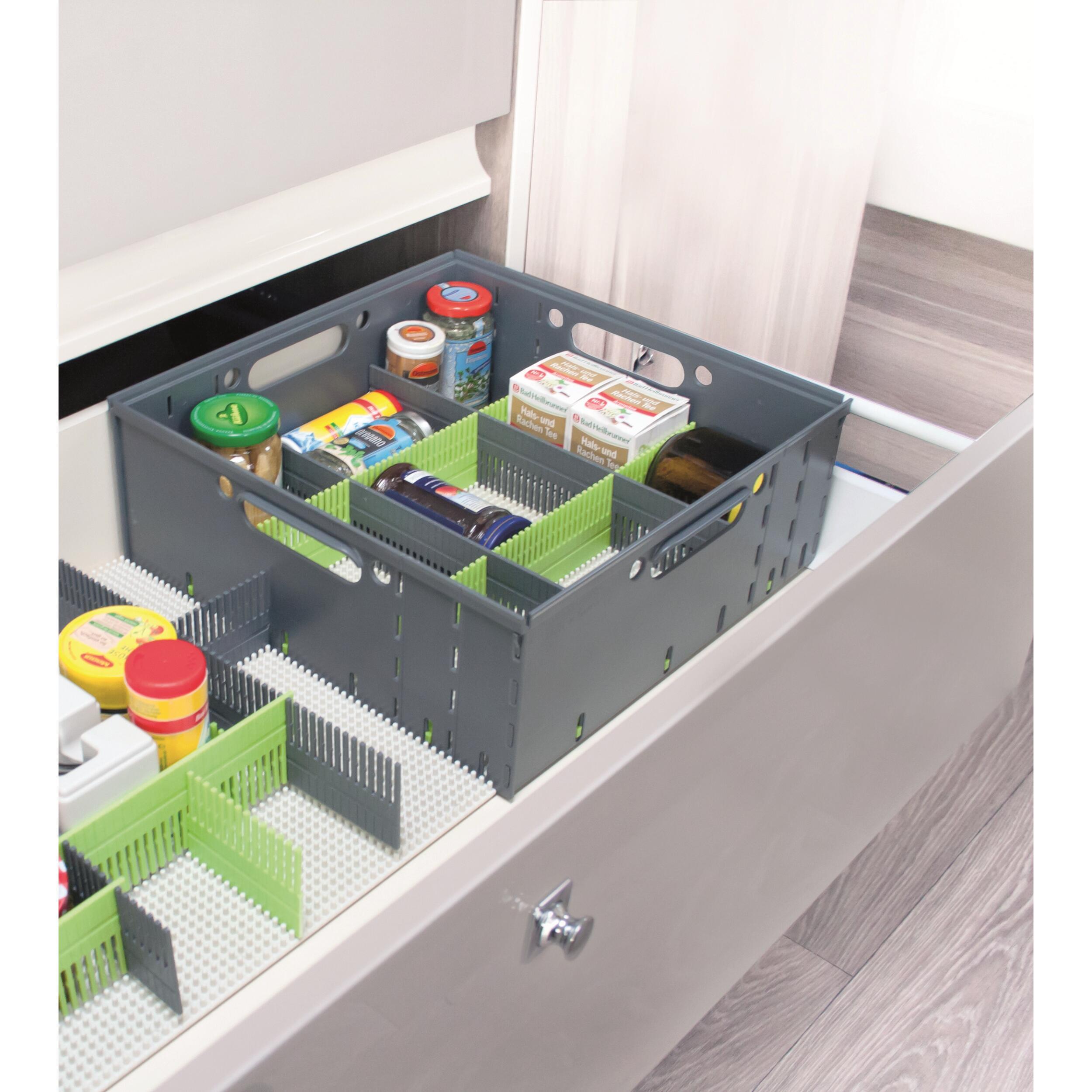 Les panneaux latéraux, le tapis à clous On-Top et les organiseurs de tiroir sont perforés et donc de taille variable. Si nécessaire, vous pouvez raccourcir les panneaux latéraux de 34 cm à environ 26 cm. Le tapis à clous et les organiseurs de tiroir sont perforés à intervalles d'environ 5 mm et sont également de taille variable. Il suffit de fixer les organiseurs de tiroir sur le tapis à clous afin de ranger divers accessoires. Les panneaux latéraux sont chacun équipés d'une poignée de transport. Les boîtes de rangement sont empilables, peu encombrantes et peuvent donc être utilisées à de nombreuses fins différentes, notamment pour des tiroirs ou des compartiments de rangement plus étroits, des boîtes de transport, des cuisines de camping, des armoires ou pour le transport dans le coffre de la voiture, etc. La boîte de rangement est composée de : 1 x tapis à clous On-Top, 4 x panneaux latéraux, 4 x organiseurs de tiroir en vert tilleul et anthracite et des clips de fixation pour stabiliser le panneau à clous.
