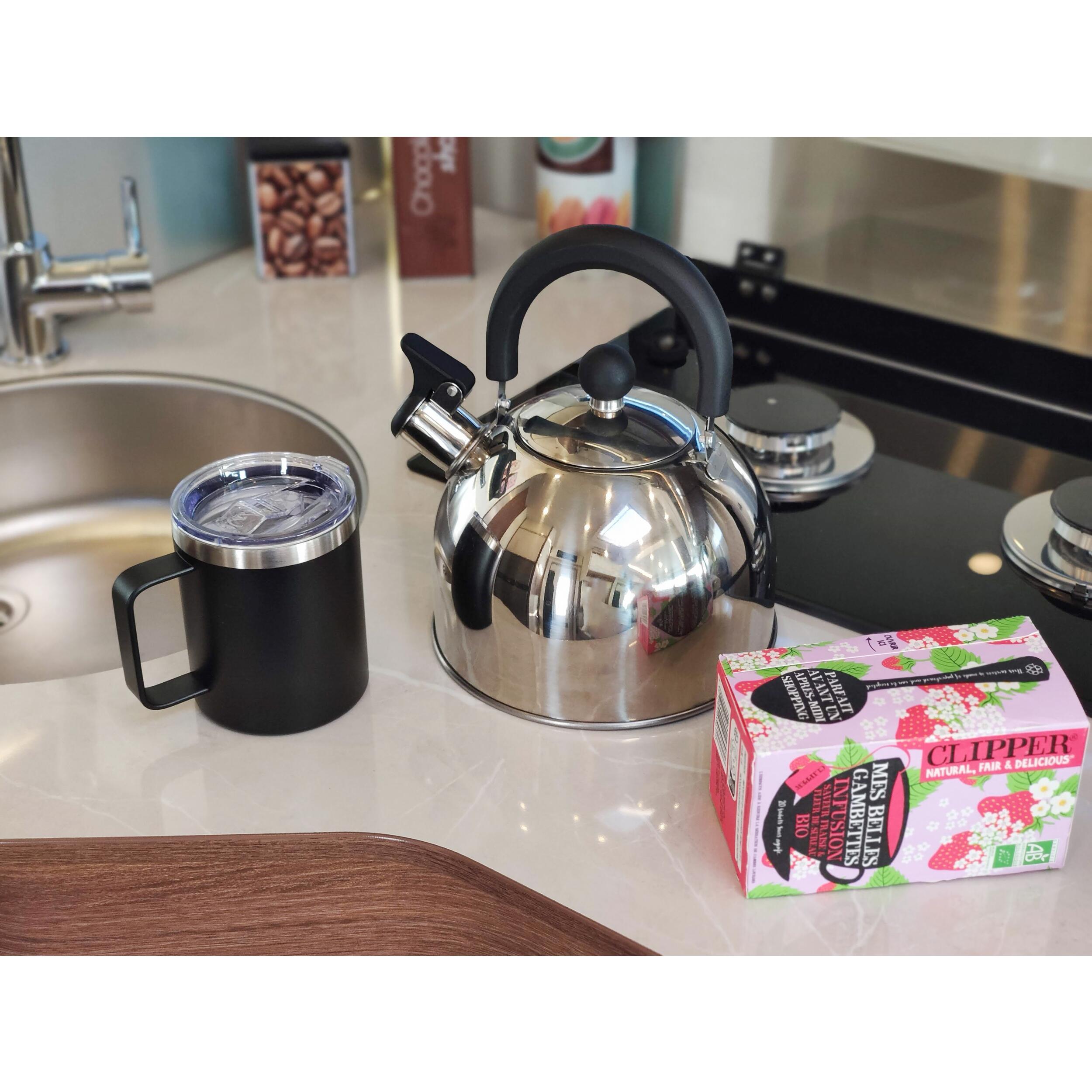 Bouilloire en acier inoxydable de 2 litres, résistante et esthétique, parfaite pour chauffer de l'eau lors de vos voyages en camping-car, fourgon ou van. Facile à nettoyer et conçue pour durer.