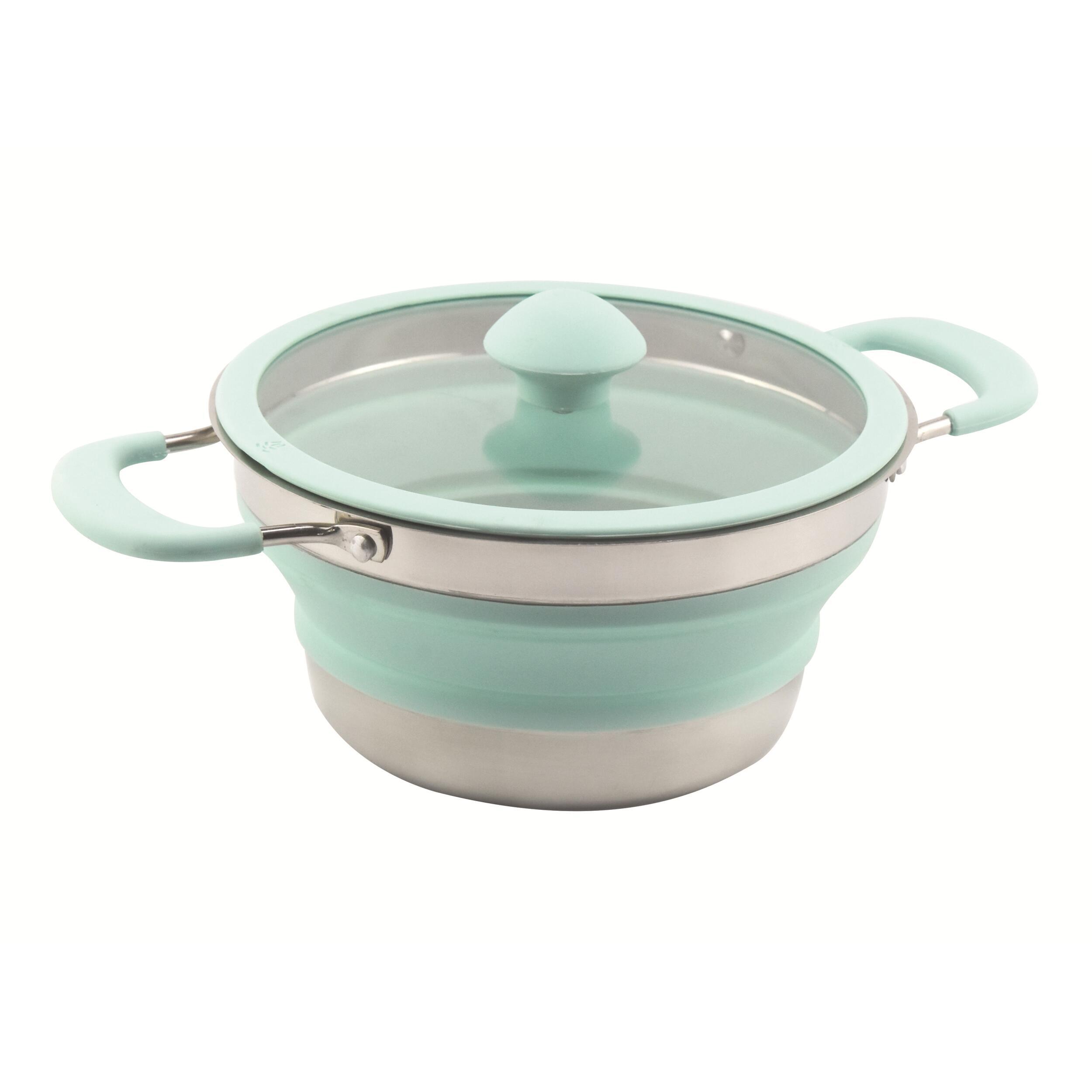 En silicone rétractable, acier inoxydable et verre renforcé. Couvercle en verre fourni. Convient pour tous types de feux sauf induction et passe au four jusqu'à 200°C.