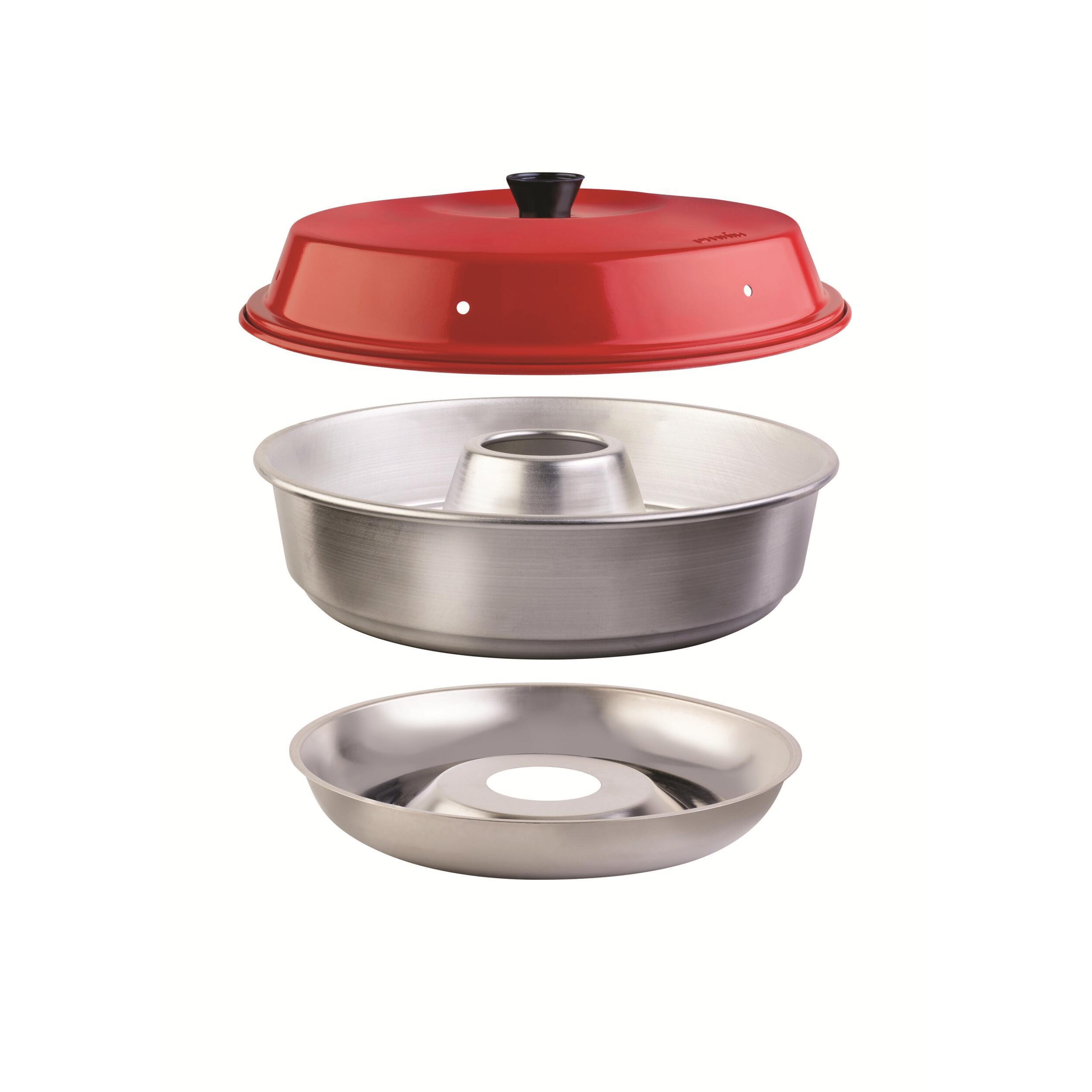 Il est constitué de 3 éléments : un châssis en inox SS430 robuste avec un trou central, un moule de 2 litres en aluminium de 25 cm de diamètre, également troué en son centre, et un couvercle en aluminium.