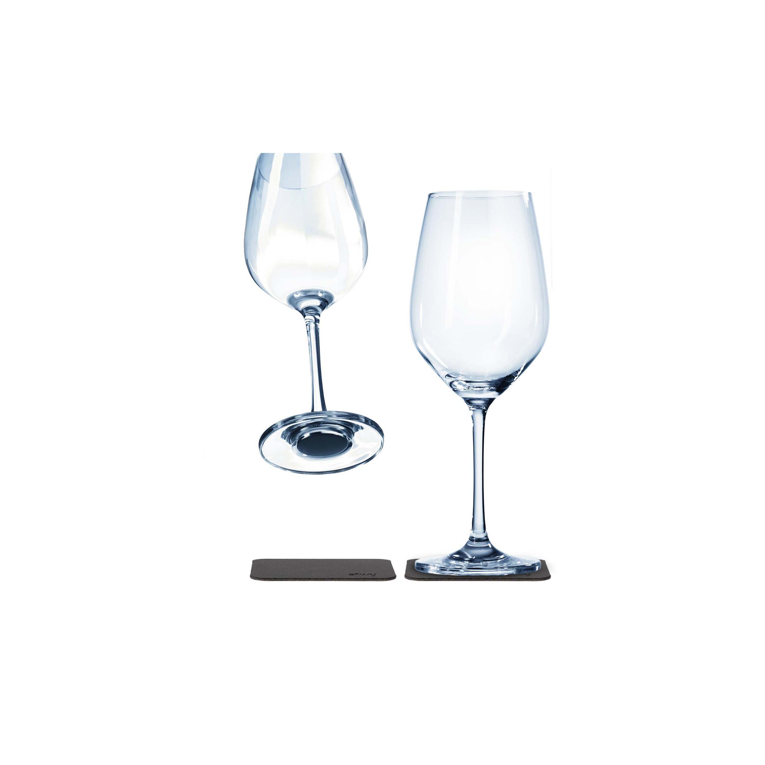 La marque Silwy propose ce lot de verres à vin en cristal avec aimants intégrés, accompagné de ses 2 dessous de verre antidérapants en nano-gel.
