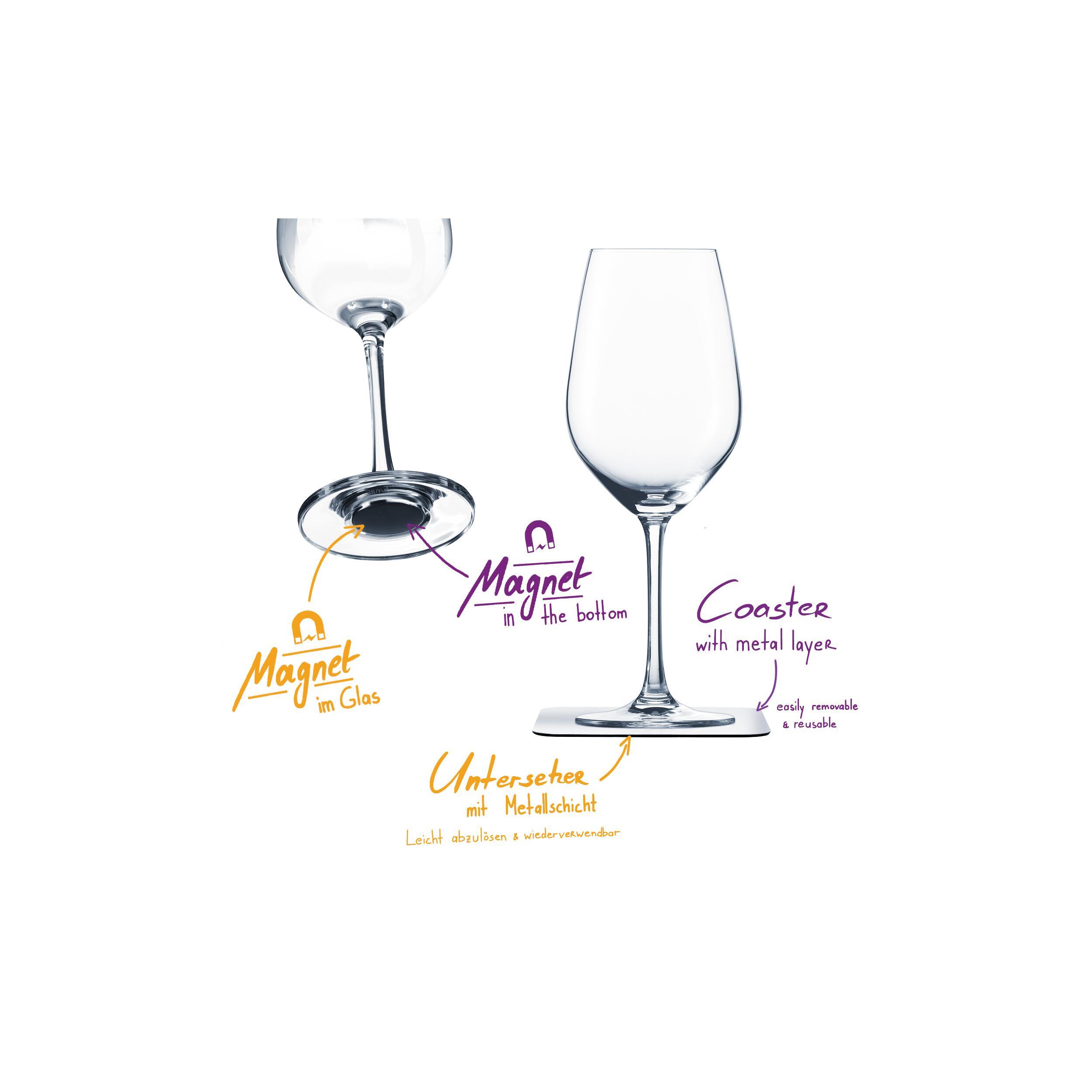 Ce lot de verres à vin en cristal avec aimants intégrés, accompagné de ses 2 dessous de verre antidérapants en nano-gel.