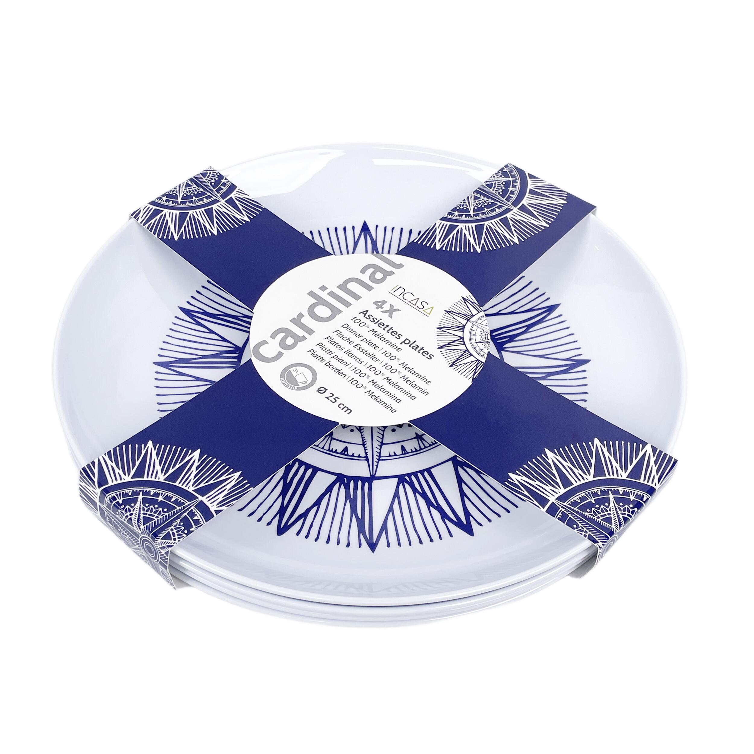 Pack de 4 assiettes en mélamine Cardinal Ø 25 cm motif rose des vents bleue : une vaisselle camping voyage robuste en mélamine, élégante et résistante, parfaite pour vos repas nomades.