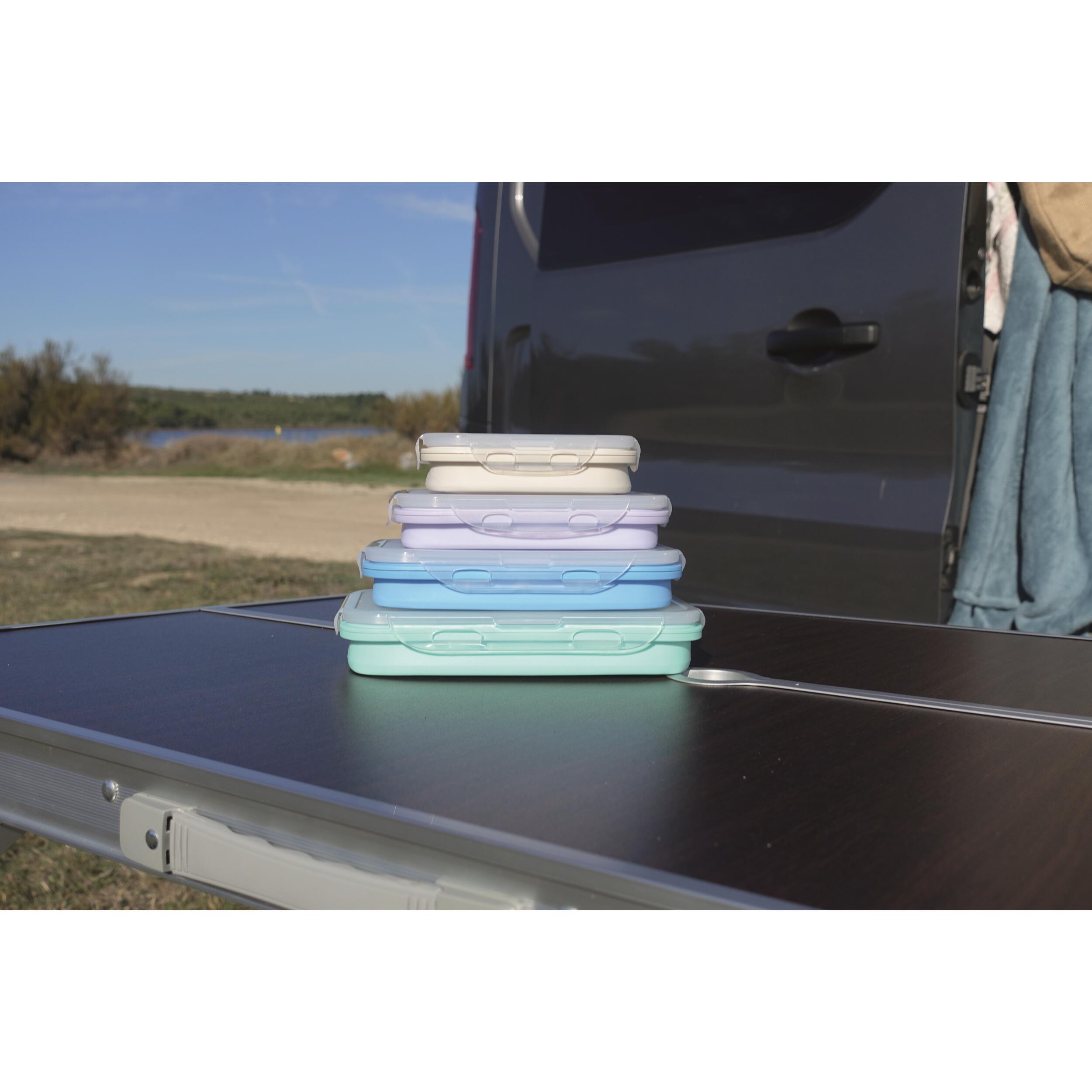 En silicone avec couvercle en plastique, elles se plient facilement afin de gagner de la place pour le rangement.