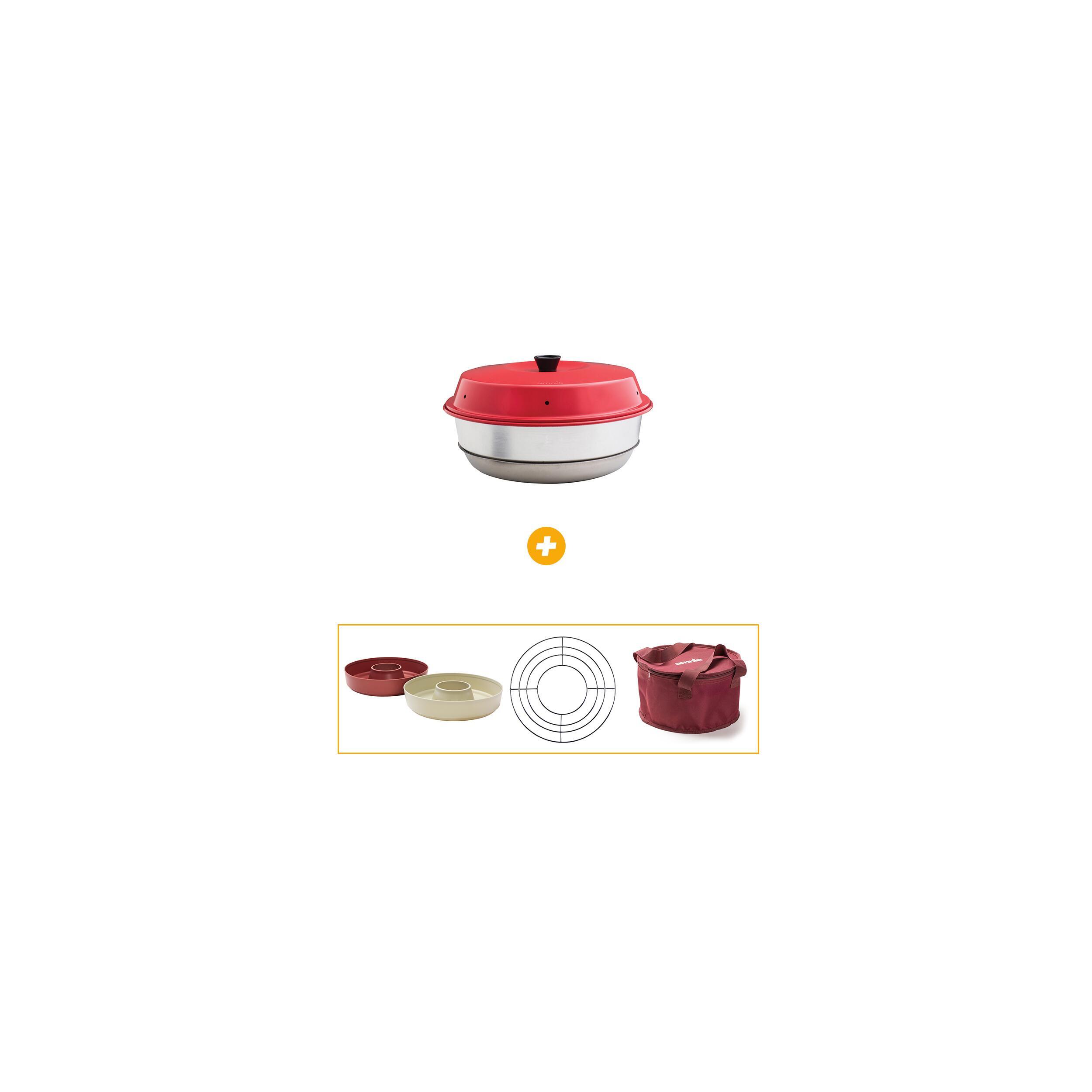 Il est constitué de 3 éléments : un châssis en inox SS430 robuste avec un trou central, un moule de 2 litres en aluminium de 25 cm de diamètre, également troué en son centre, et un couvercle en aluminium.