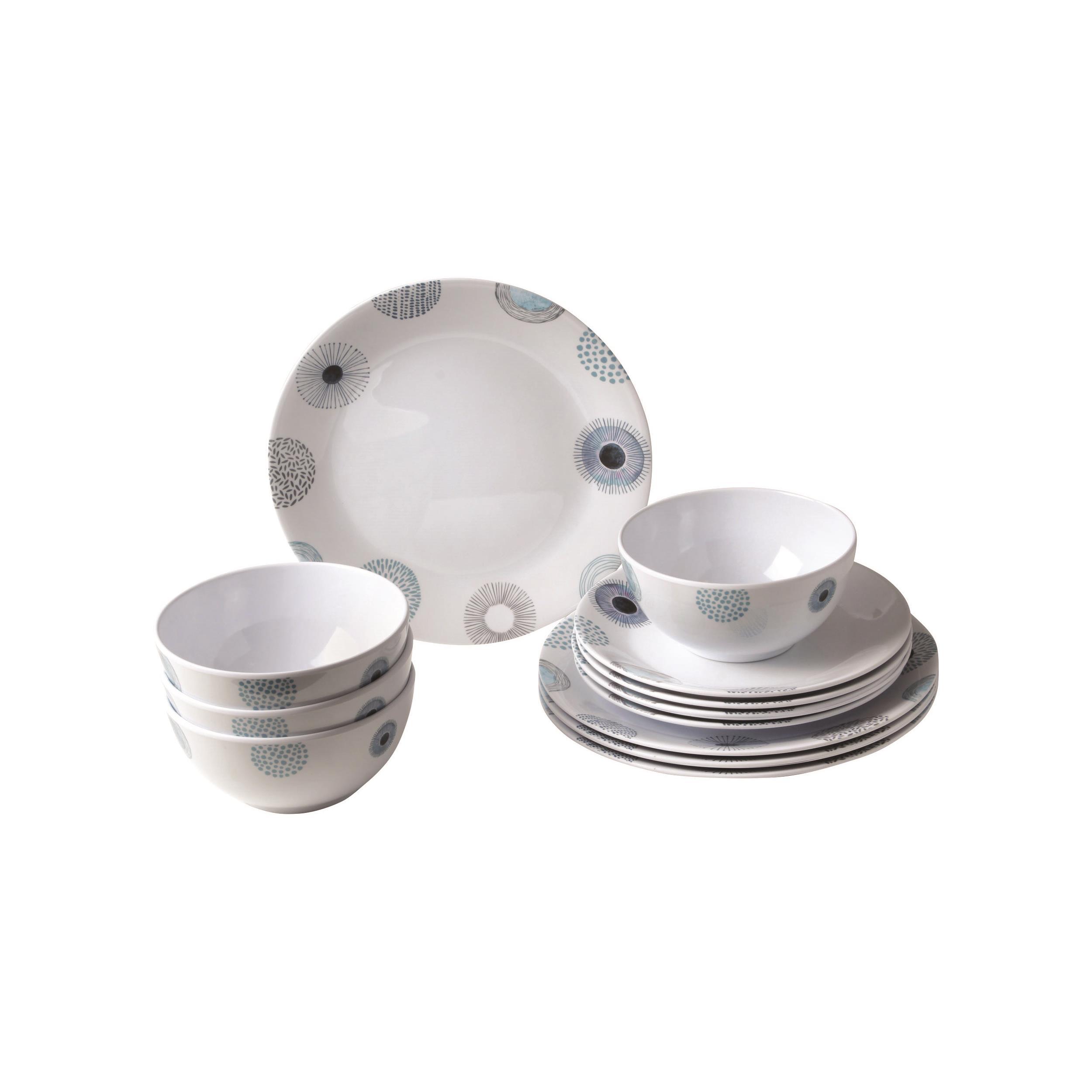 Pack vaisselle en mélamine constitué de 12 pièces : 4 assiettes diamètre 25 cm, 4 assiettes diamètre 20 cm et 4 bols diamètre 15 cm.