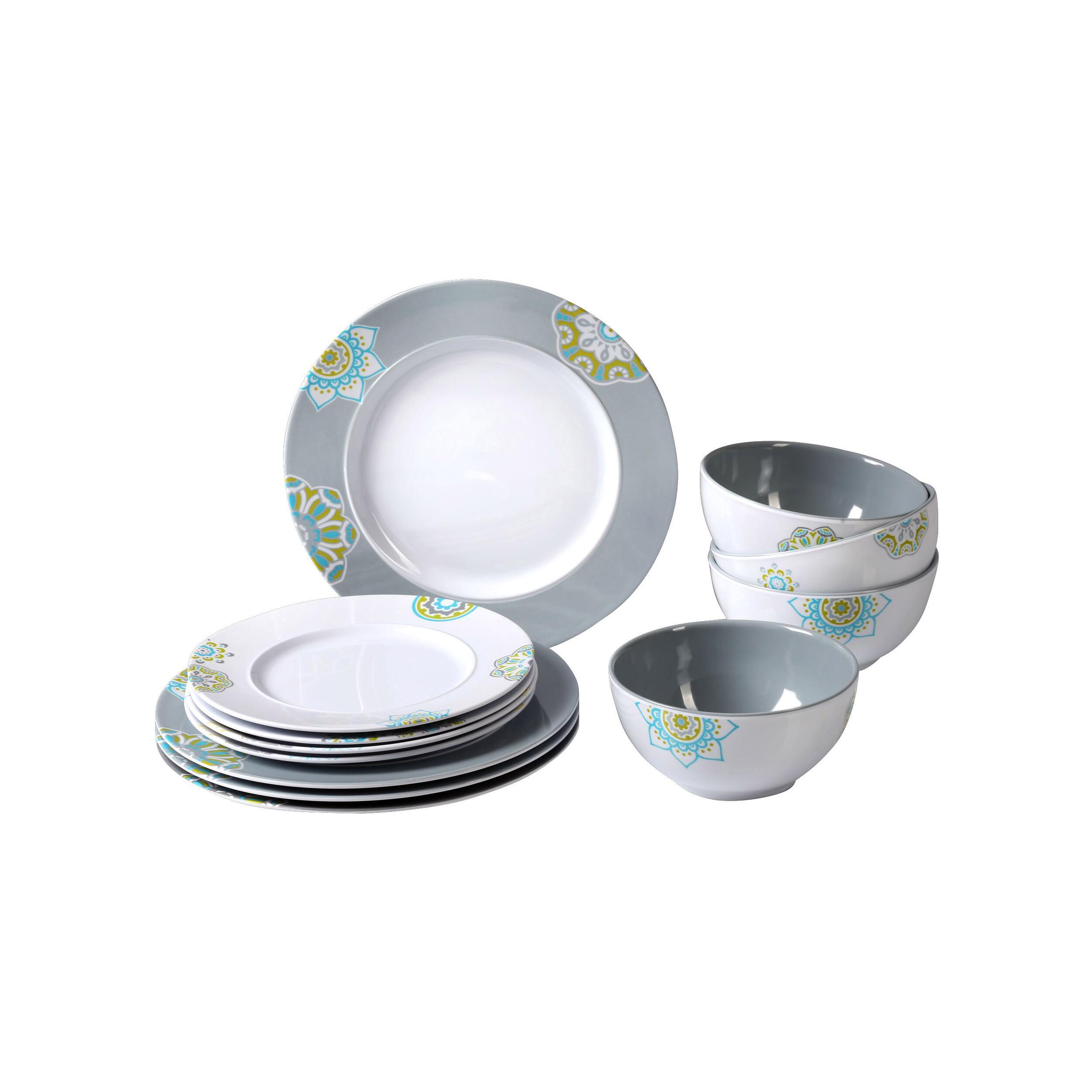 Pack vaisselle en mélamine constitué de 12 pièces : 4 assiettes diamètre 26 cm, 4 assiettes diamètre 21 cm et 4 bols diamètre 15 cm.