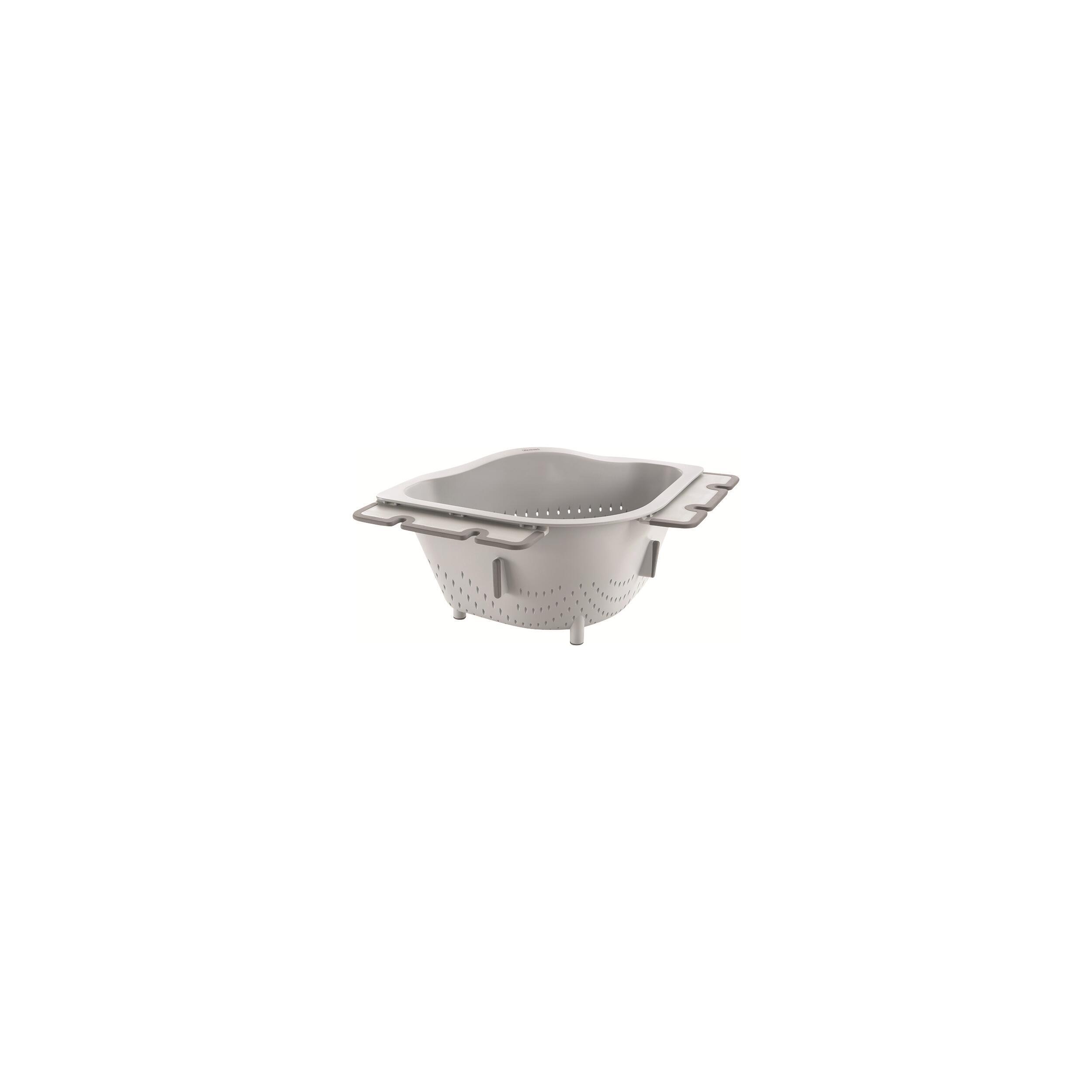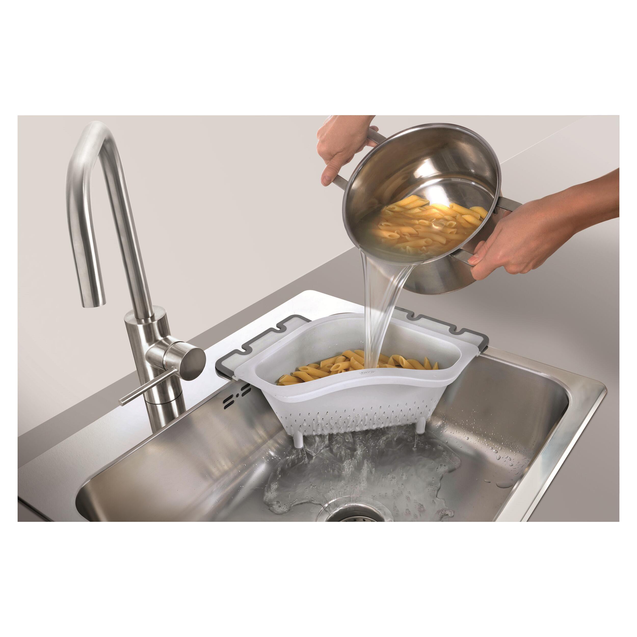 S'installe dans votre évier. Avec 4 pieds antidérapants. Poignées ajustables selon la forme de votre évier.