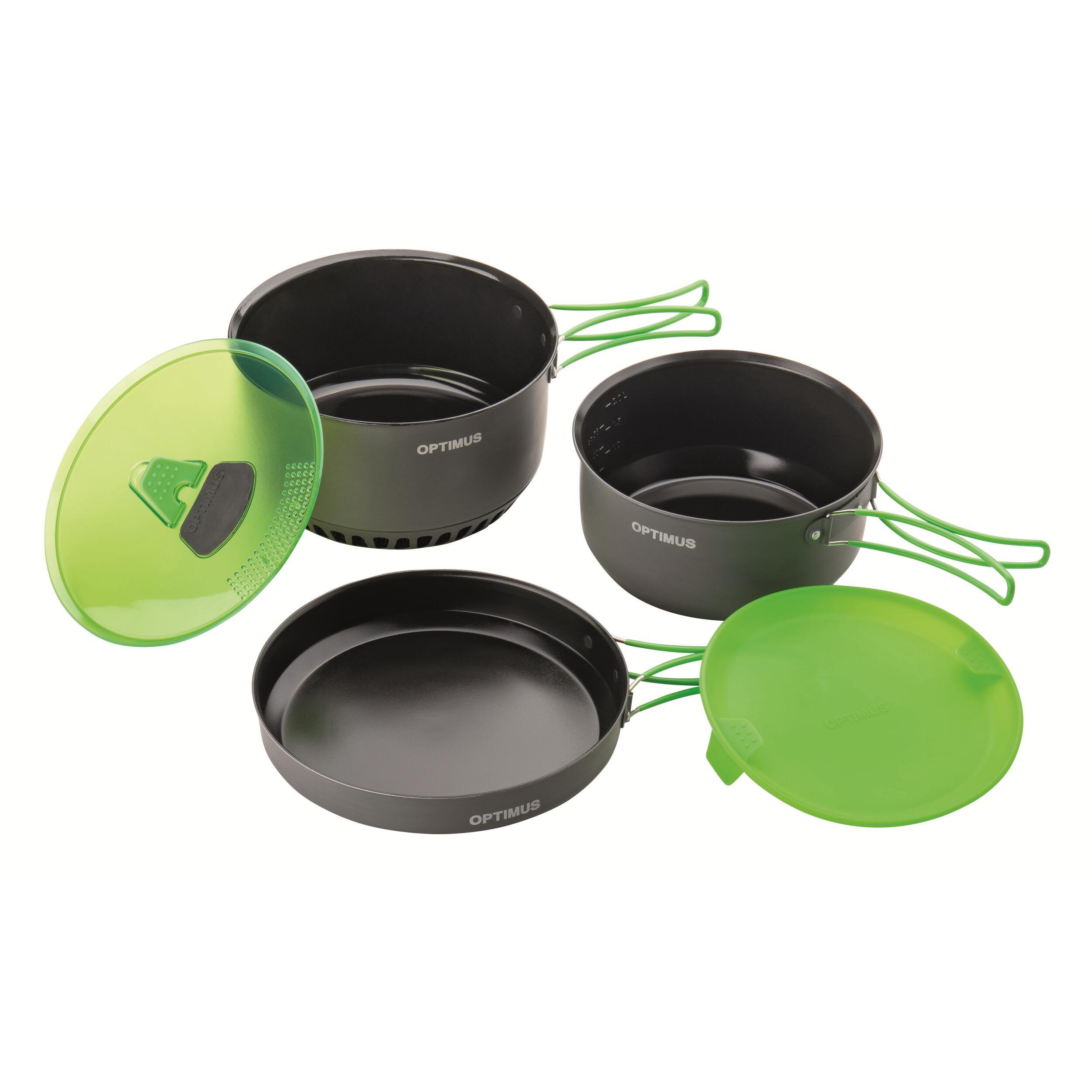 Ensemble de 7 pièces en aluminium anodisé,composé d'une poêle avec revêtement anti-adhésif en céramique, de deux casseroles ultra légères en revêtement non-adhésif en PTFE durable (2,3 L et 3,2 L), d'un couvercle en silicone souple, d'un couvercle/passoire en plastique transparent, d'un sac thermo et d'un insert anti-rayures.