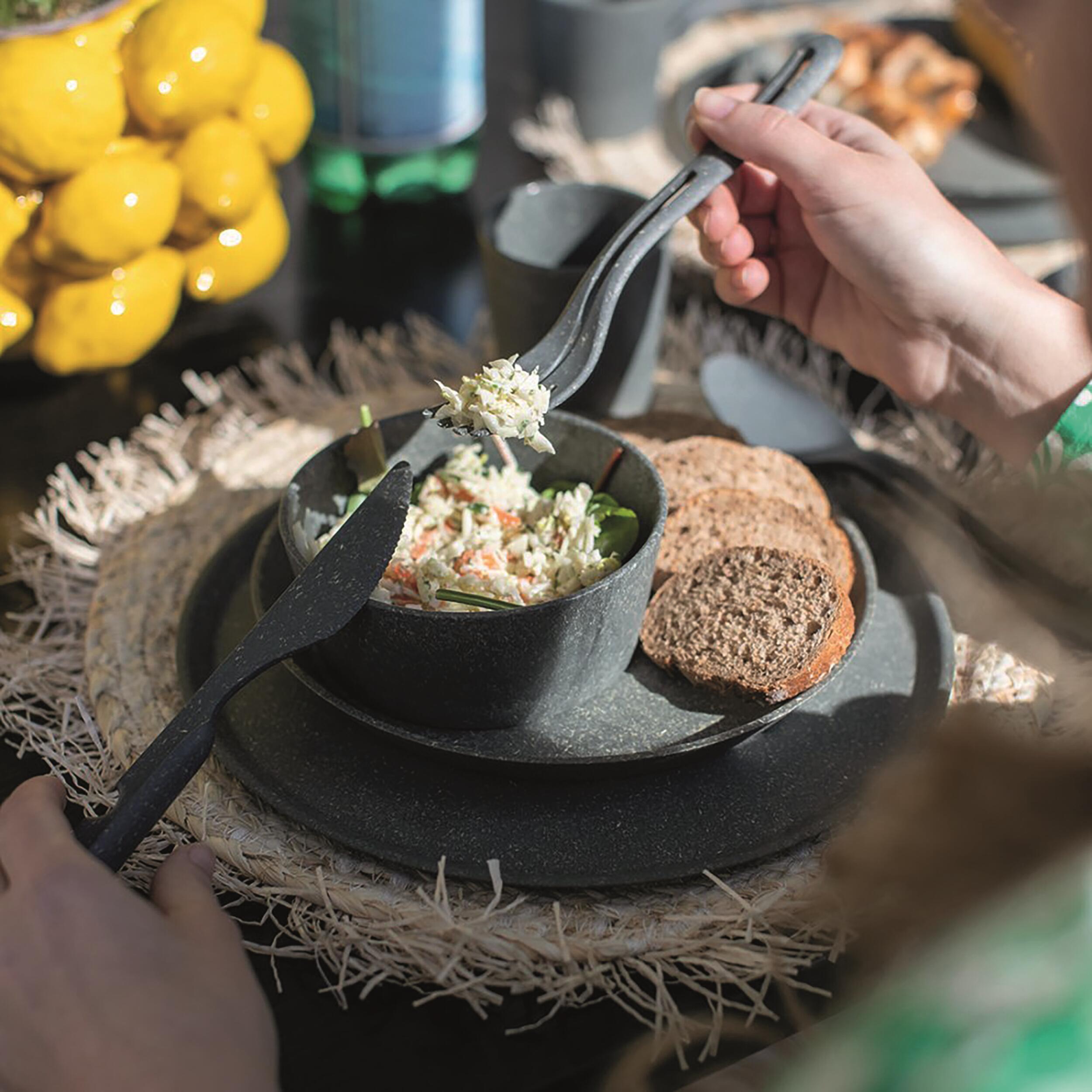 Enfin, un ensemble de couverts à emporter qui est juste de la bonne taille. Les trois pièces sont faciles à démonter et à remettre en place sans aucune hésitation :il suffit de soulever le couteau au niveau de la lame et de le pousser vers le bas. Toutes les pièces tiennent confortablement dans la main et sont extrêmement légères, ce qui permet de les glisser dans n'importe quel type de sac.