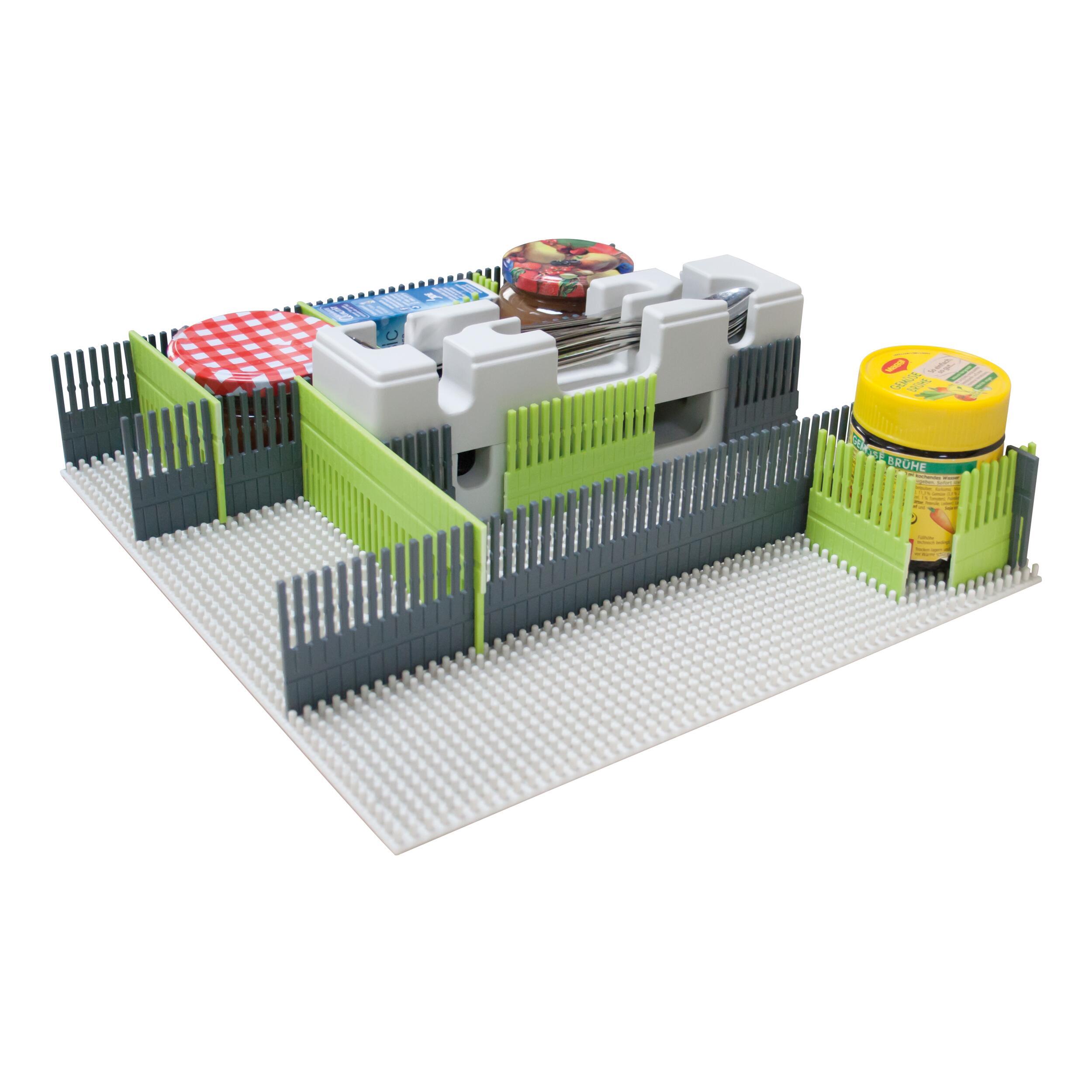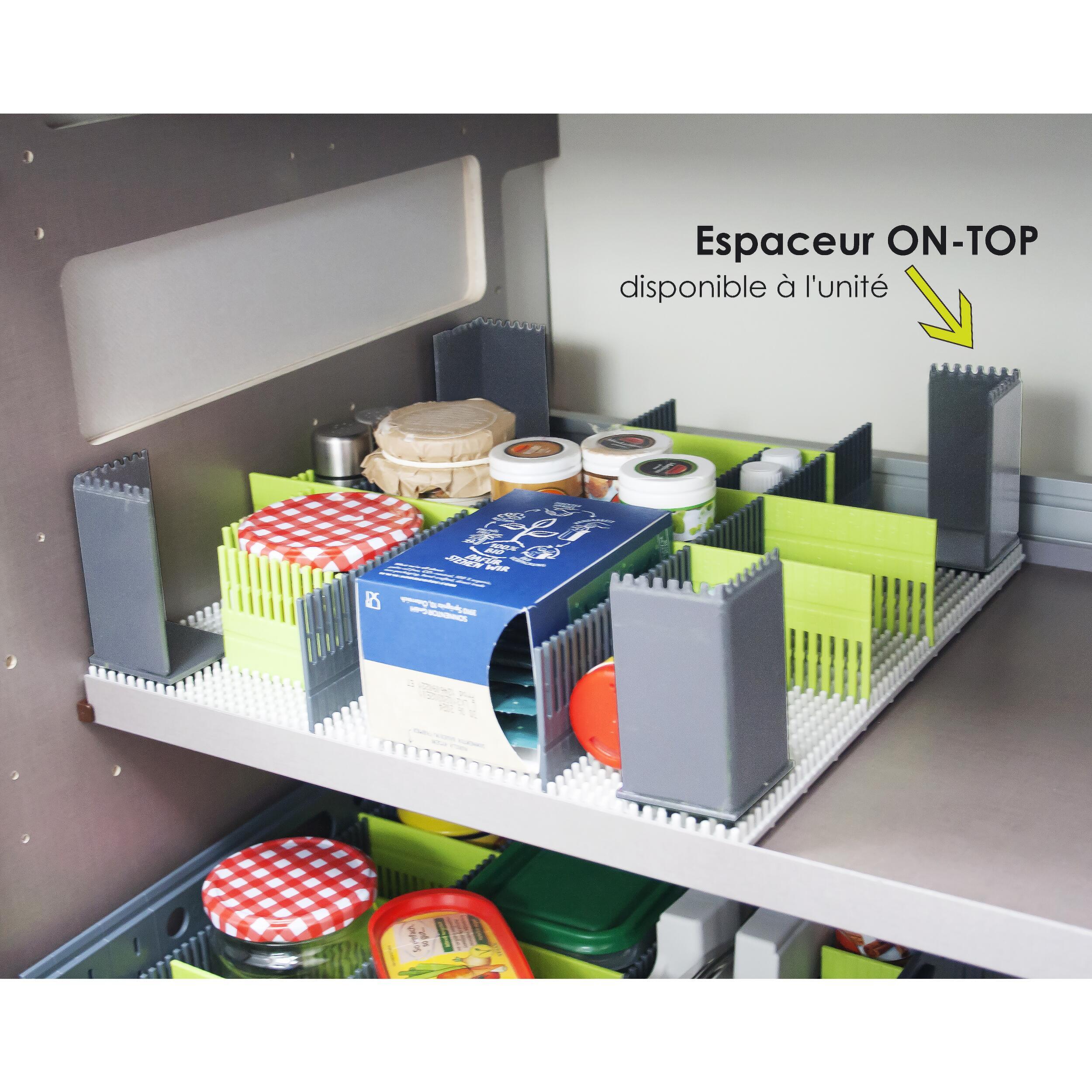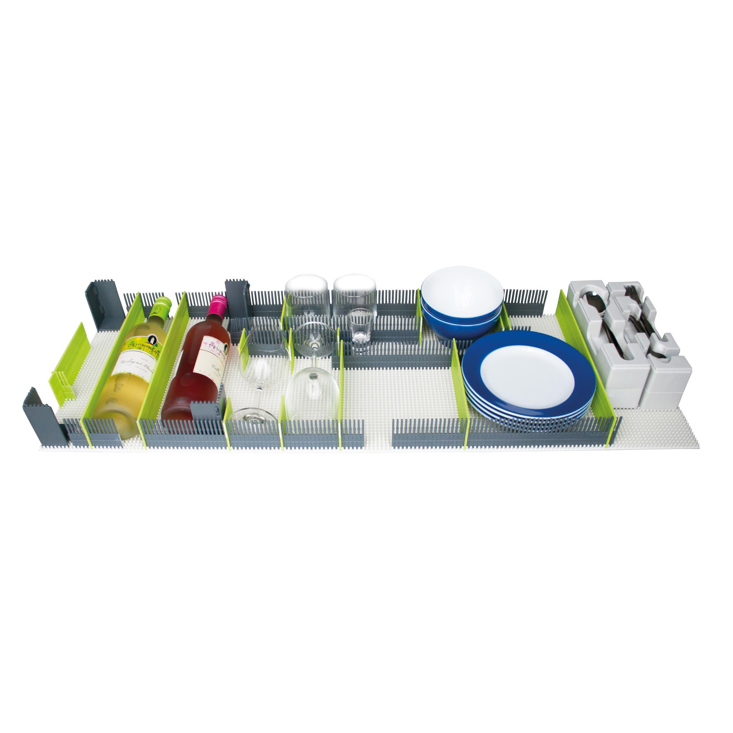 Le matériau robuste et indéformable de ce tapis à clous assure un maintien sûr. Il peut être utilisé comme plaque de base, par exemple pour les organiseurs de tiroir, les organiseurs de réfrigérateur ou même les maxi organiseurs. Les espaceurs On-Top peuvent venir complèter le tapis pour une adaptation dans les divers espaces de rangement.