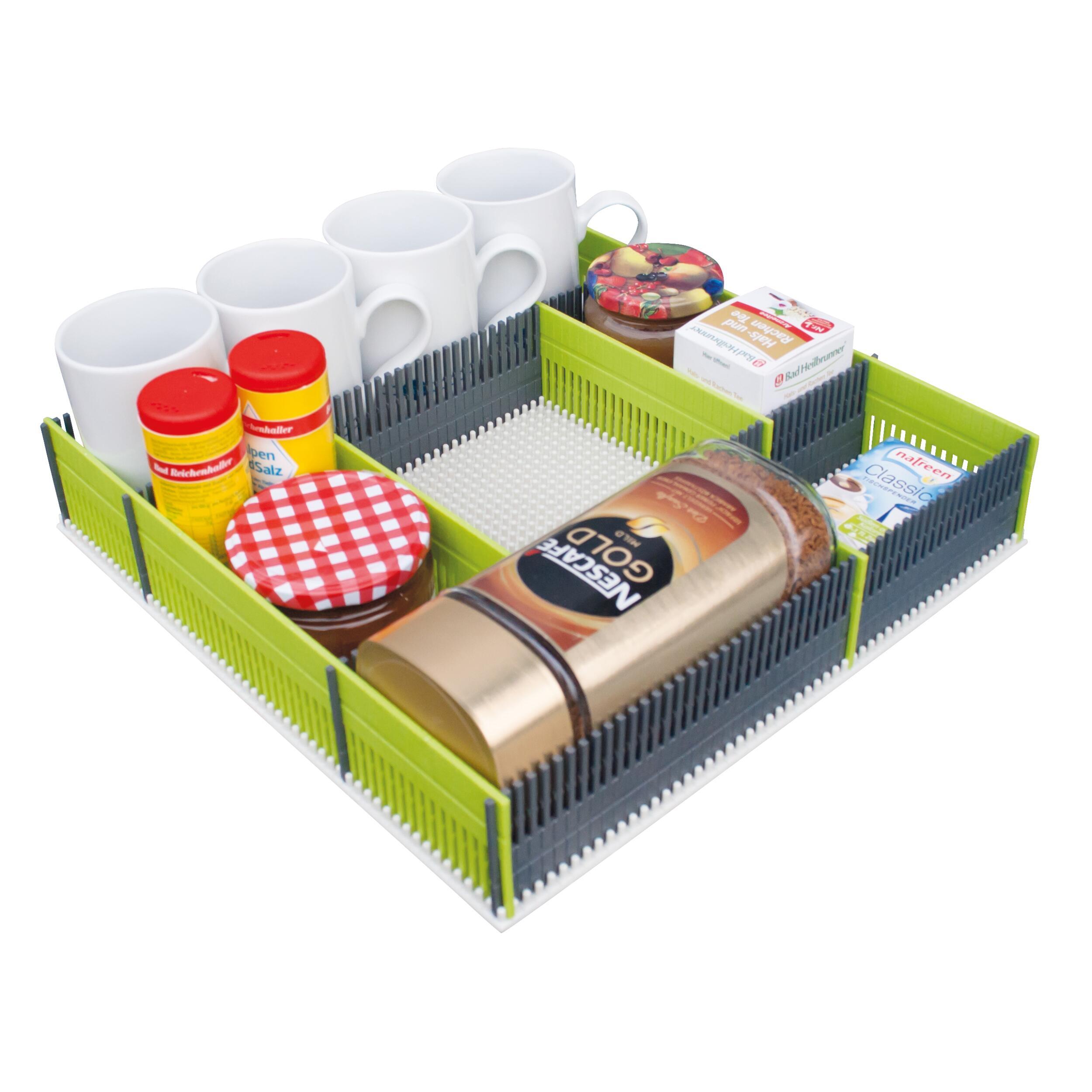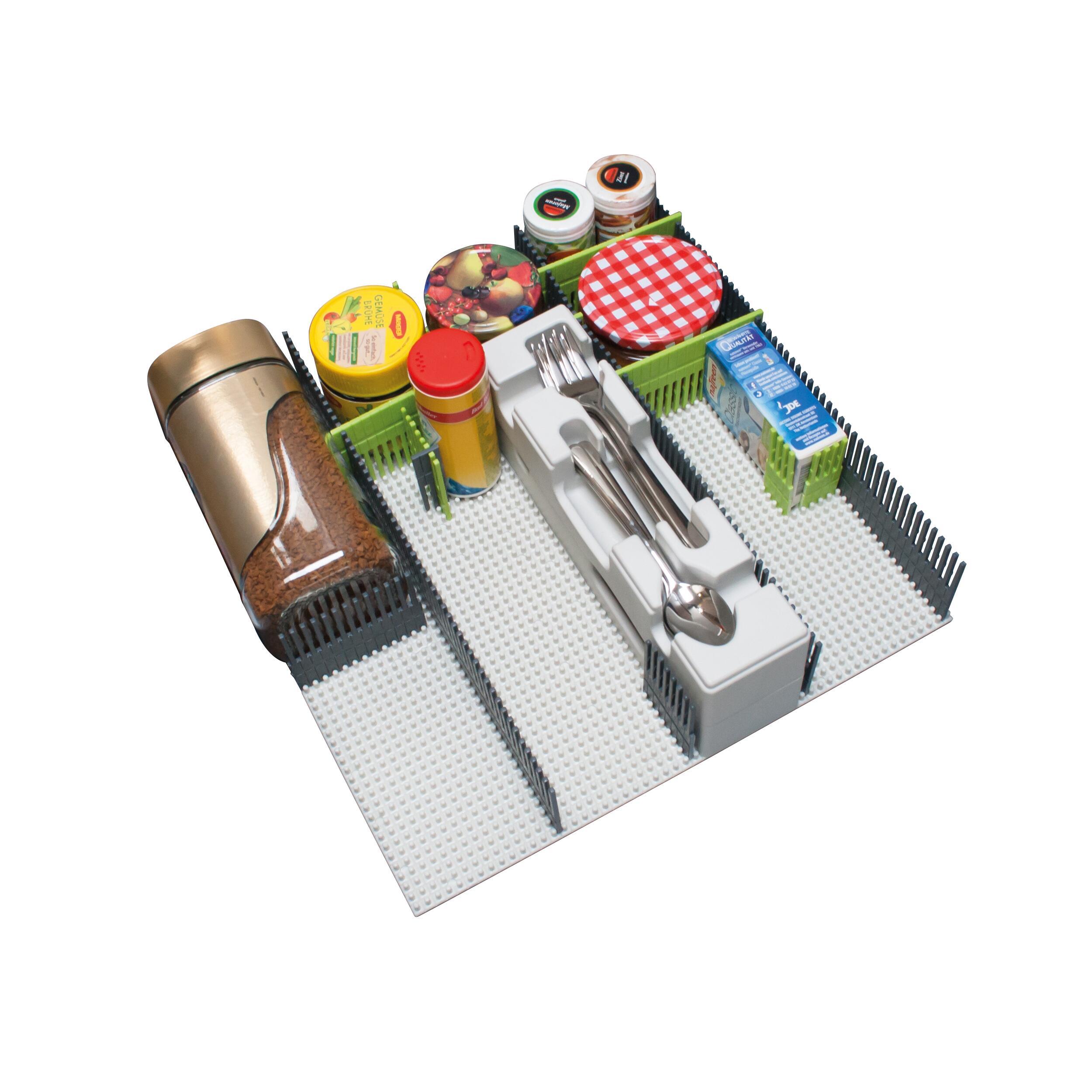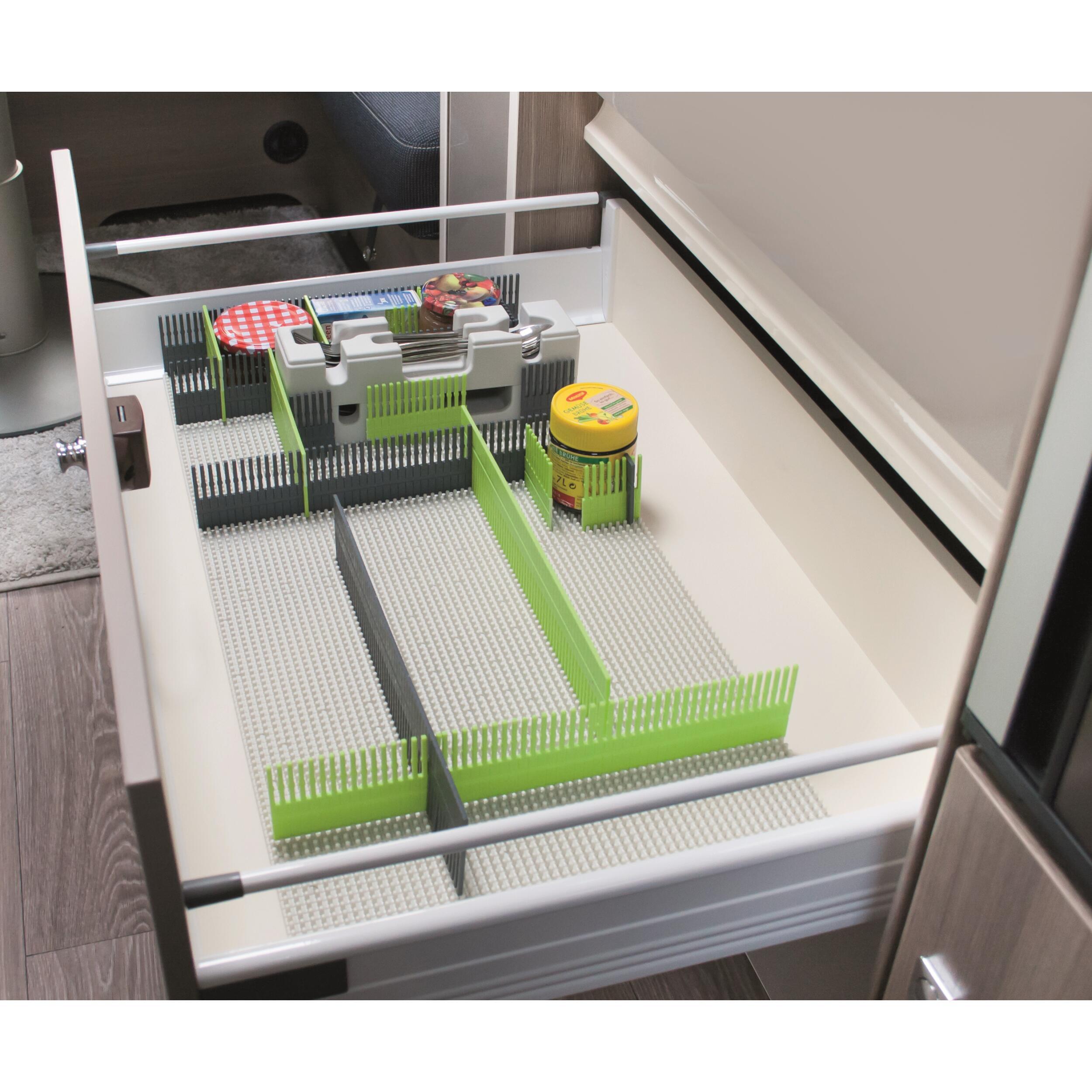 Le matériau robuste et indéformable de ce tapis à clous assure un maintien sûr. Il peut être utilisé comme plaque de base, par exemple pour les organiseurs de tiroir, les organiseurs de réfrigérateur ou même les maxi organiseurs. Les espaceurs On-Top peuvent venir complèter le tapis pour une adaptation dans les divers espaces de rangement.