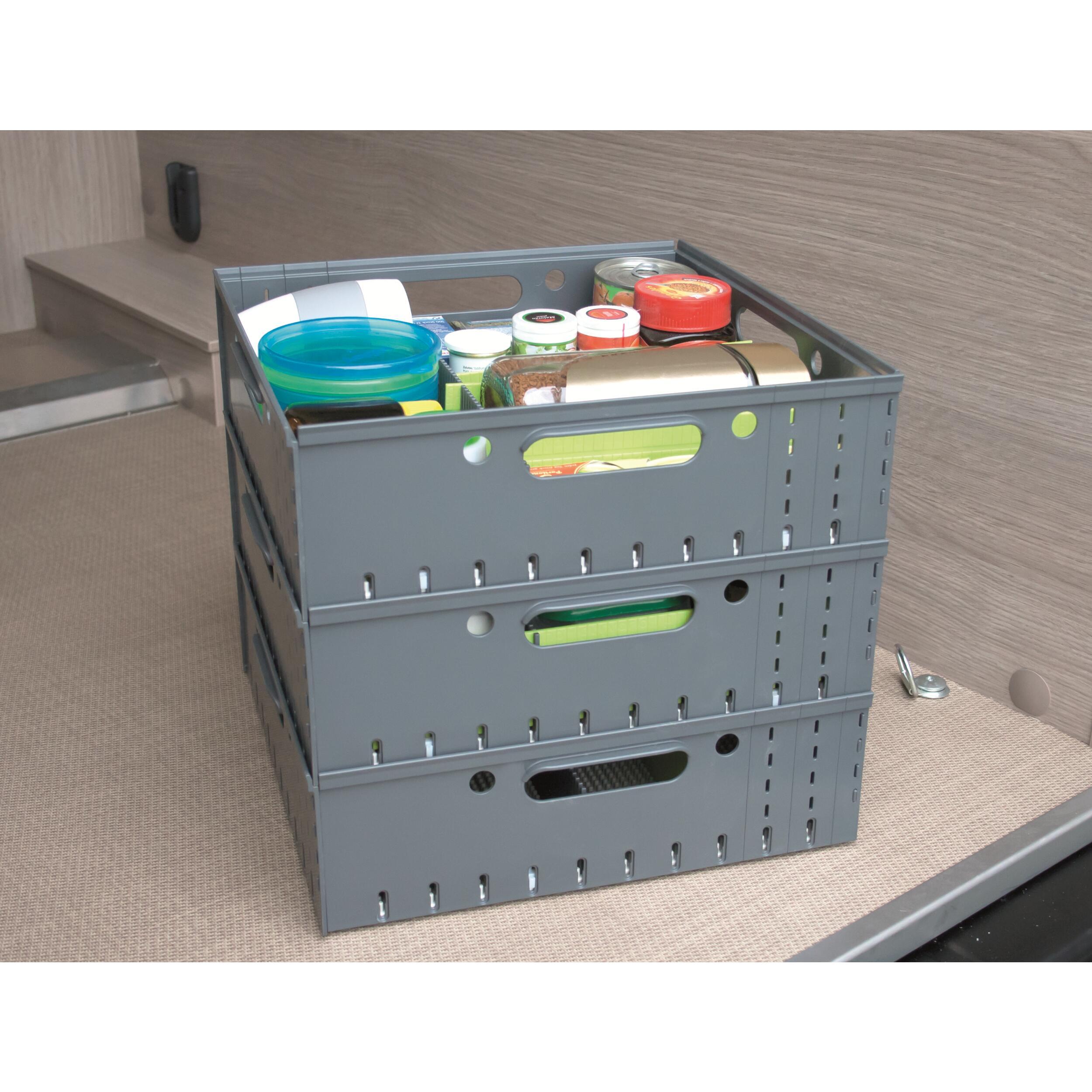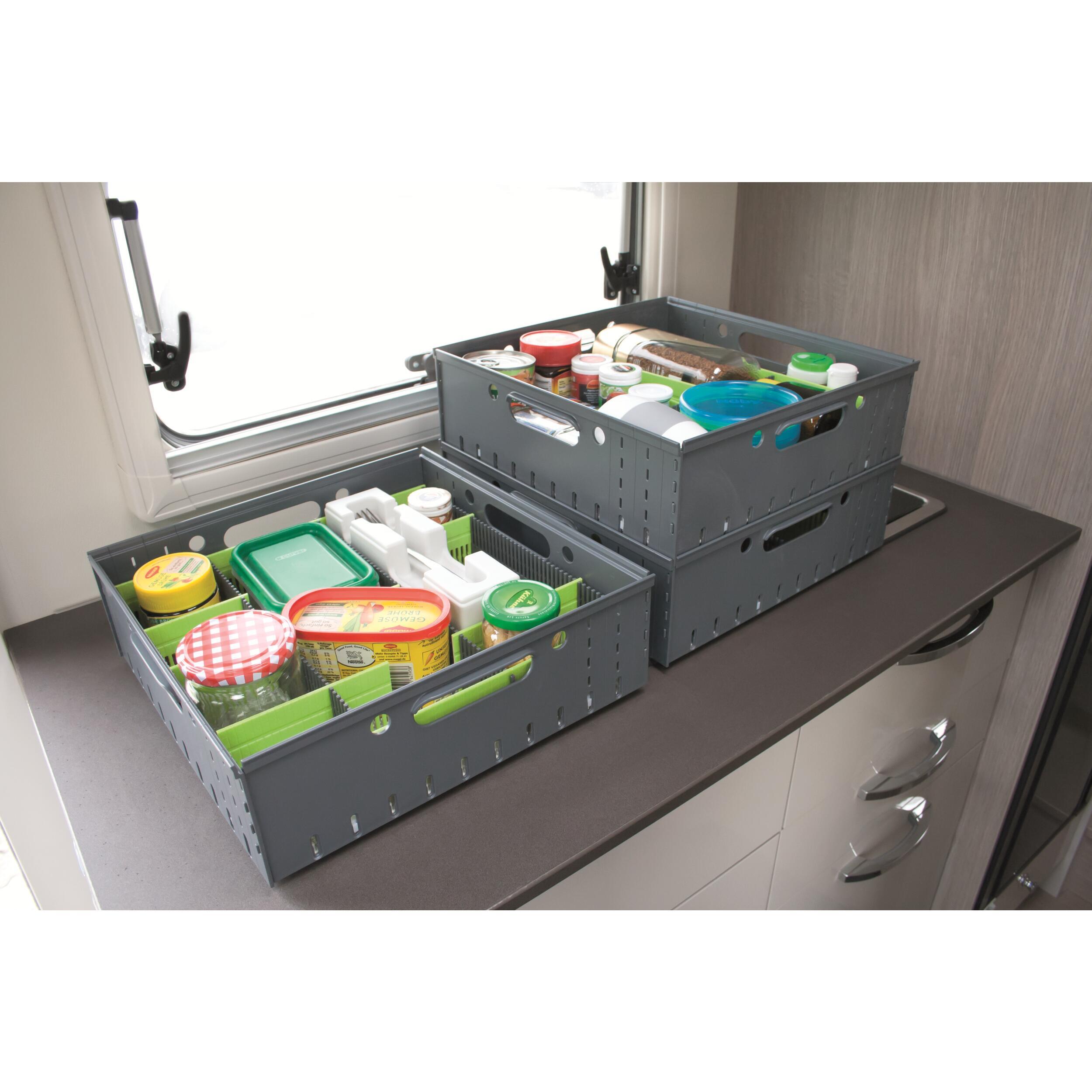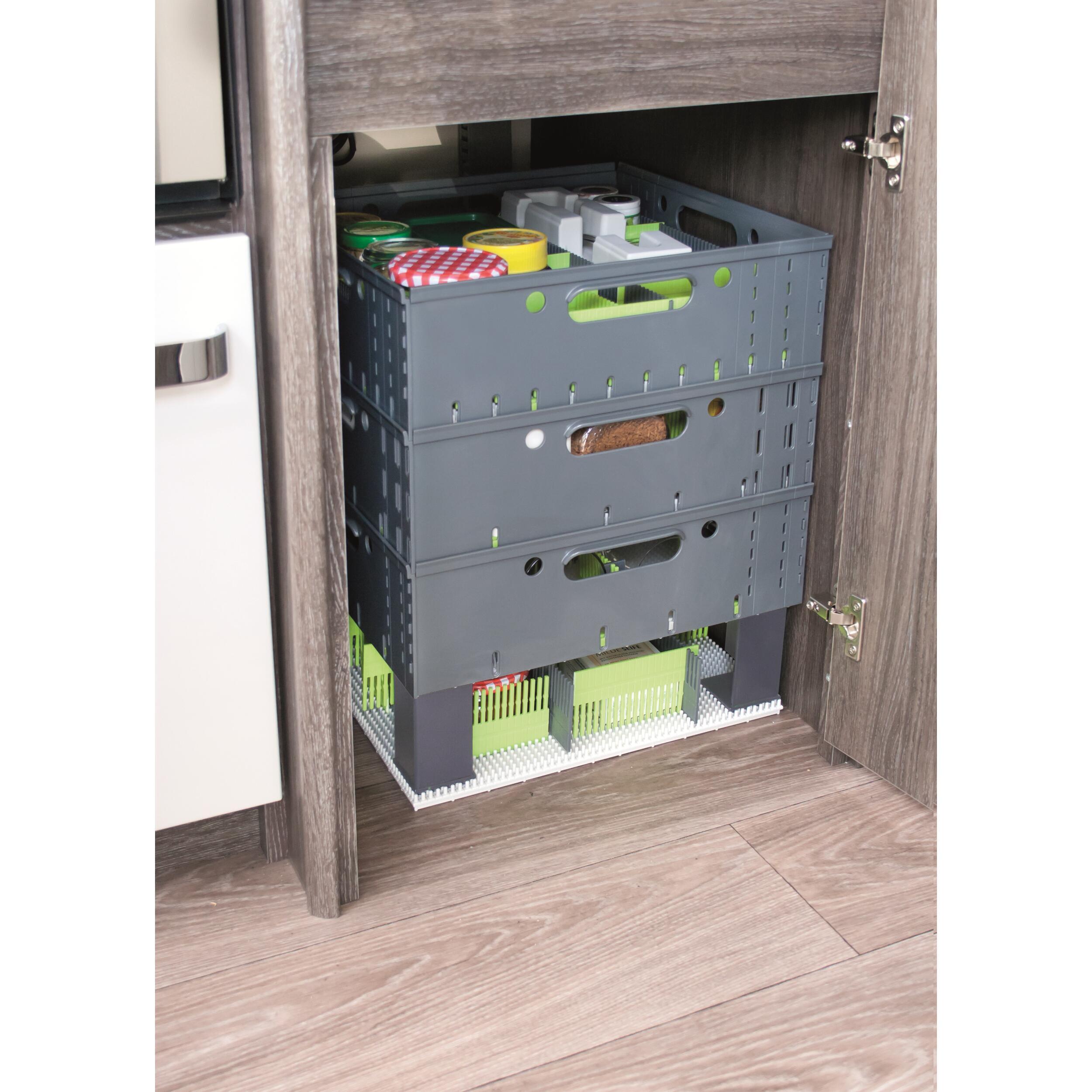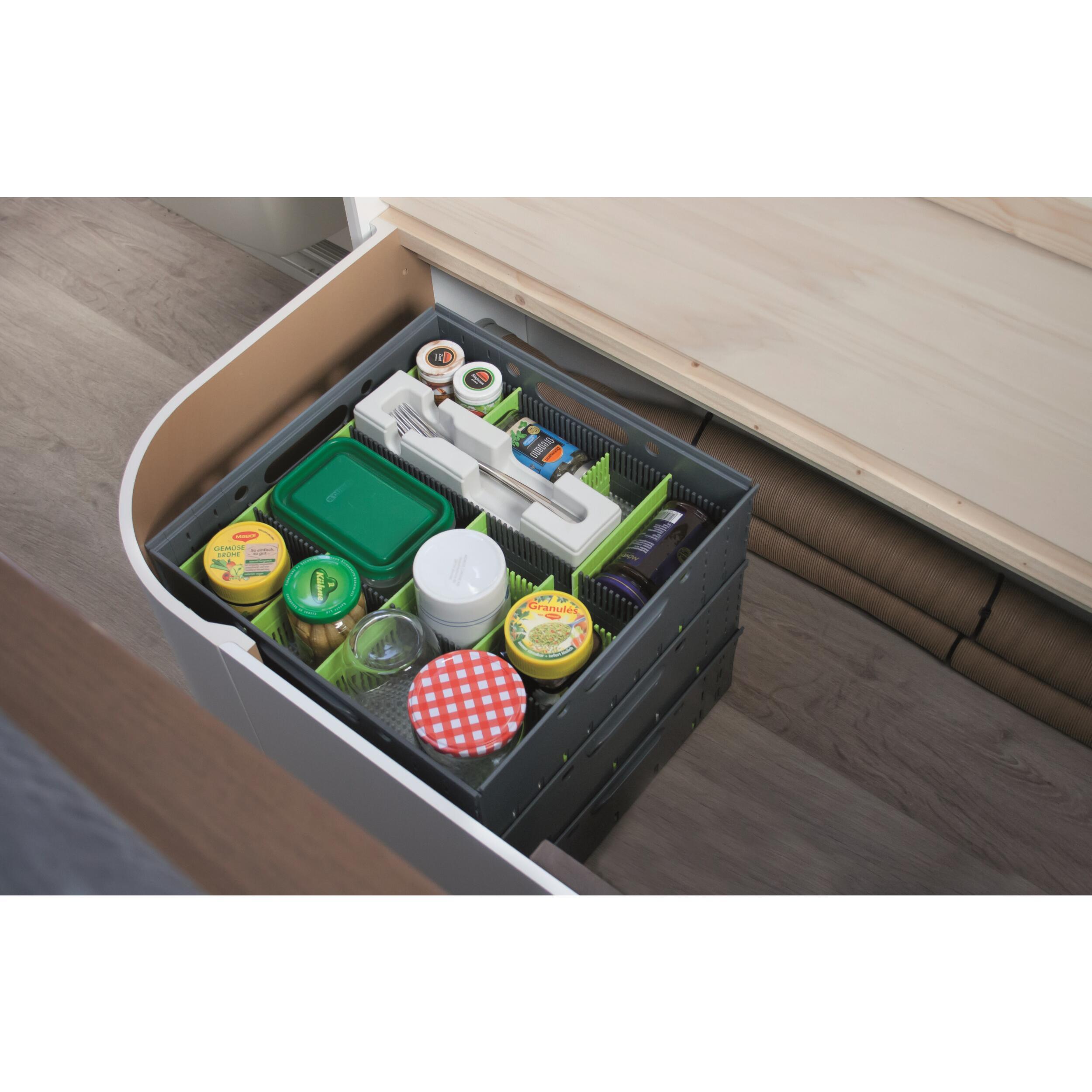 La tour de rangement se compose de trois boîtes de rangement empilables, qui peuvent également être utilisées individuellement. Les panneaux latéraux, le tapis à clous On-Top et les organiseurs de tiroir sont perforés et donc de taille variable. Si nécessaire, vous pouvez raccourcir les panneaux latéraux de 34 cm à environ 26 cm. Le tapis à clous et les organiseurs de tiroir sont perforés à intervalles d'environ 5 mm et sont également de taille variable. Il suffit de fixer les organiseurs sur le tapis à clous afin de ranger divers accessoires. Les panneaux latéraux sont chacun équipés d'une poignée de transport. La tour de rangement est composée de : 3 x tapis On-Top, 12 x panneaux latéraux, 1 x couvercle, 12 x organiseurs de tiroir en vert tilleul et anthracite et de clips de fixation pour stabiliser le tapis à clous.