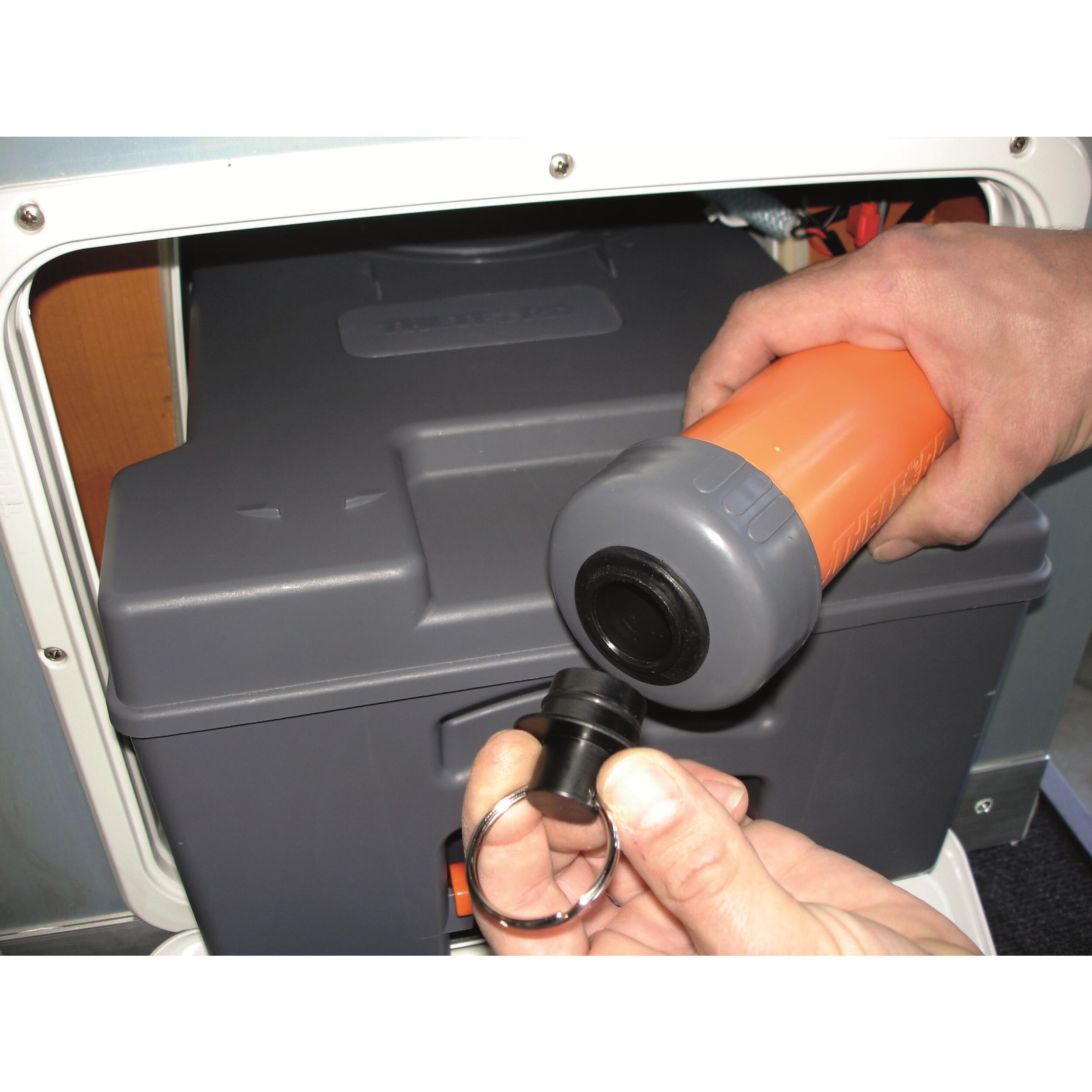 Assure un dégazage permanent. Plus besoin de produits chimiques ni d'additifs. Ce système se raccorde sur le réservoir à matières. Une turbine 12 V aspire les gaz, les conduit jusqu'à un filtre à charbon actif anti-odeurs puis les rejette à l'extérieur du véhicule.